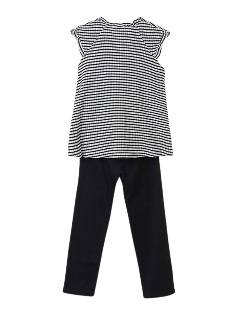 Set Mayoral. Blusa estampada preto e branco Listras. Sem mangas. Fecho de botão no pescoço. Babados decorativos. Pantalon em preto. Aberturas frontais. Tecido elástico.
