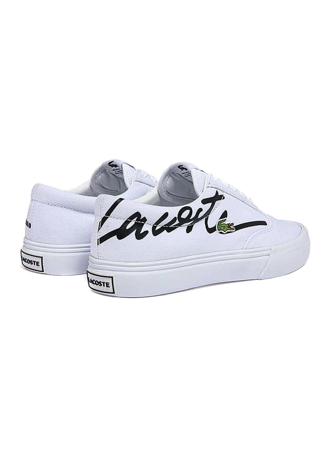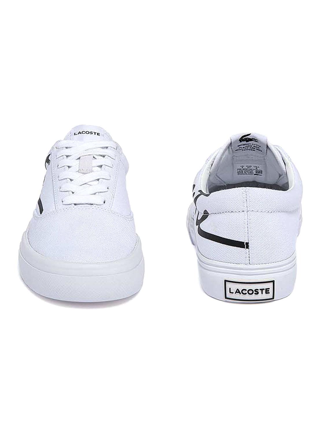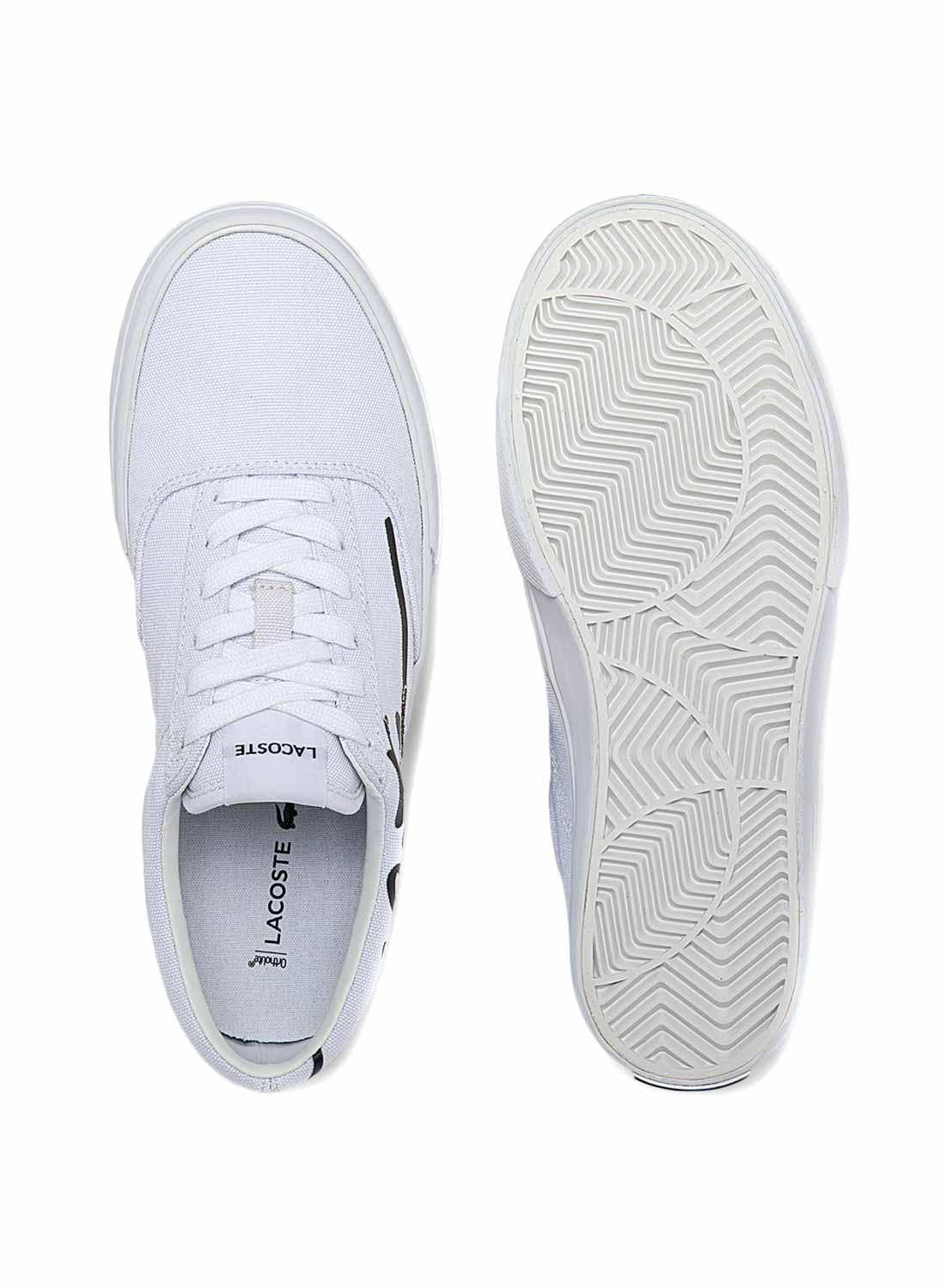Sapatilhas Lacoste. Modelo Jump Serve. Cor branca. Fechamento em cadarço. Sola borracha. Parte superior em tecido. Crocodilo verde bordado na lateral. Nome da marca na lateral, calcanhar e língua em preto.