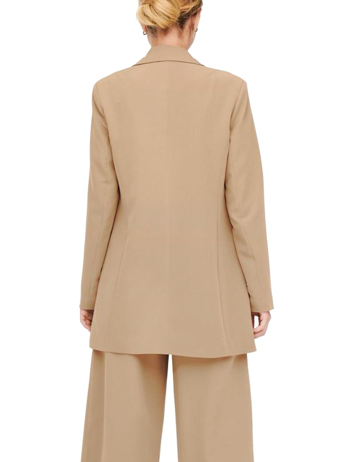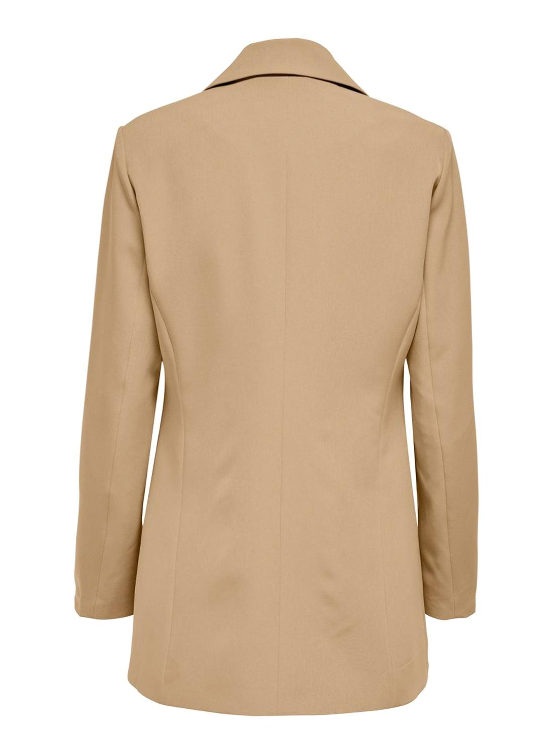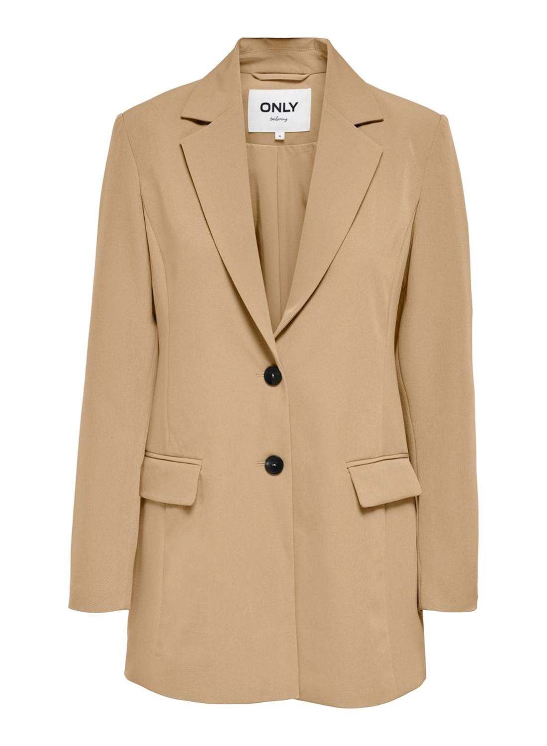 Blazer Only. Modelo Maia. Cor camel. Fechamento frontal com dois botões. Bolsos frontais com aba. Tecido elástico. Manga comprida. Decote com lapelas.