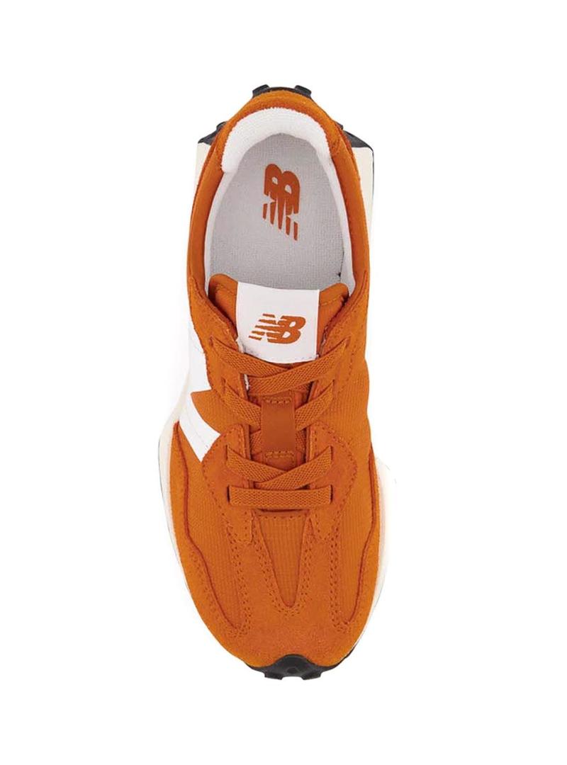 Sapatilhas New Balance. Modelo 327. Cor laranja. Fechamento em cadarço. Sola antiderrapante borracha. Logo lateral branco. Etiqueta costurada na língua.