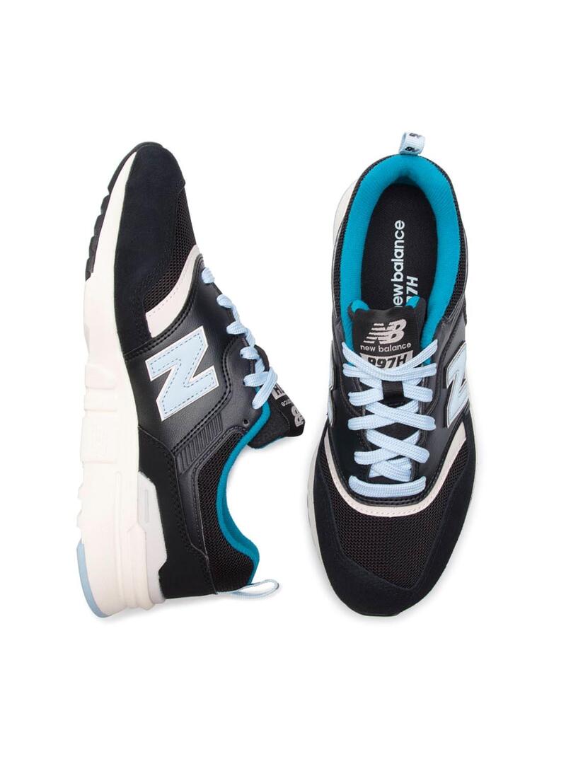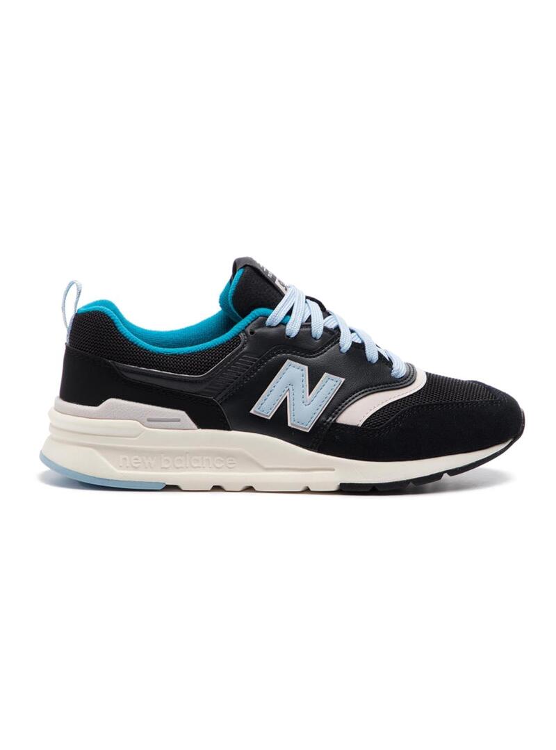 Sapatilhas New Balance. Modelo CM997 na cor preta. Fechamento de renda. Mistura de materiais sintéticos e coiro. Painéis em contraste azul turquesa. Sola de borracha levantada com logotipo. Interior têxtil. Logotipo lateral