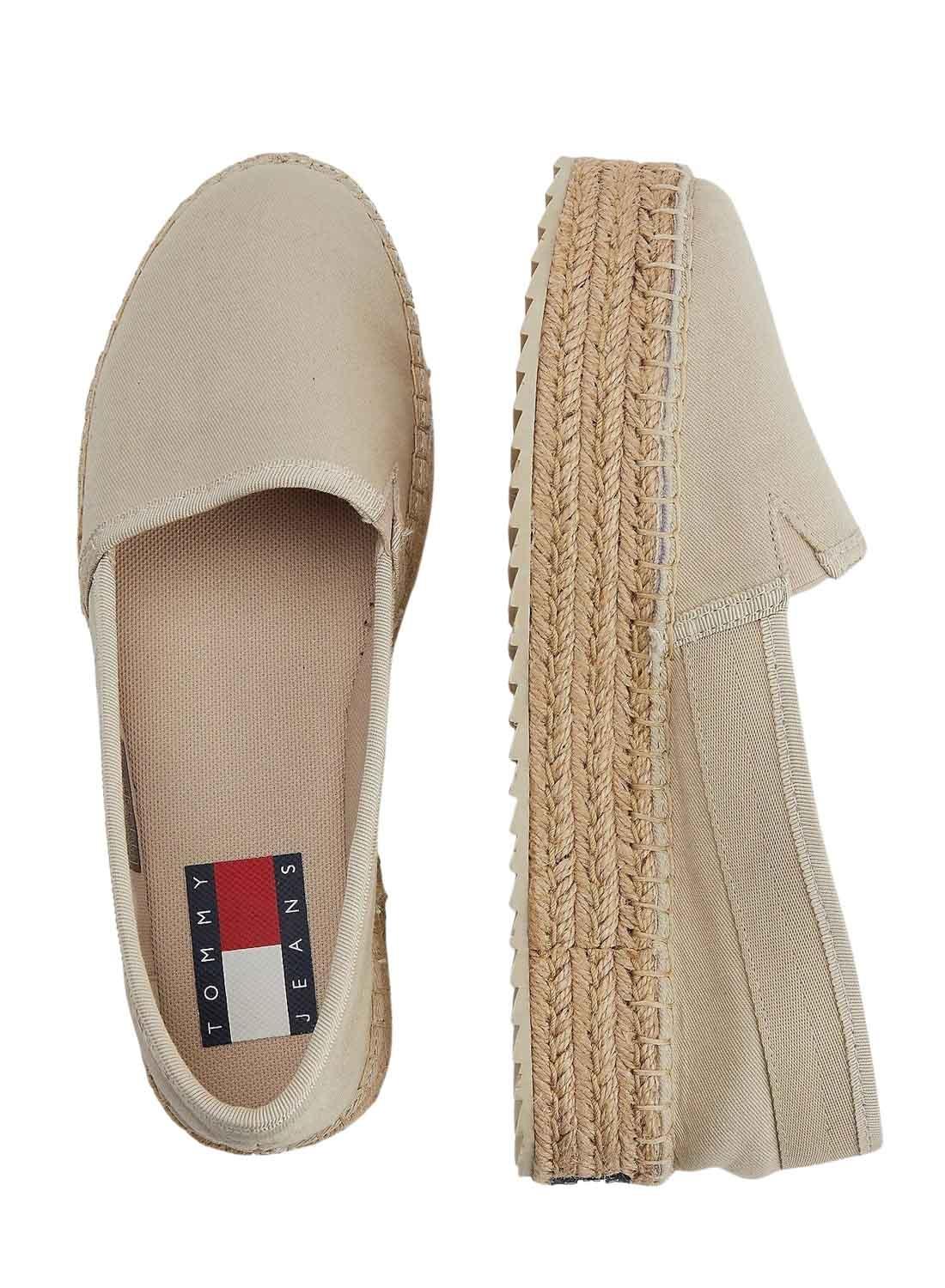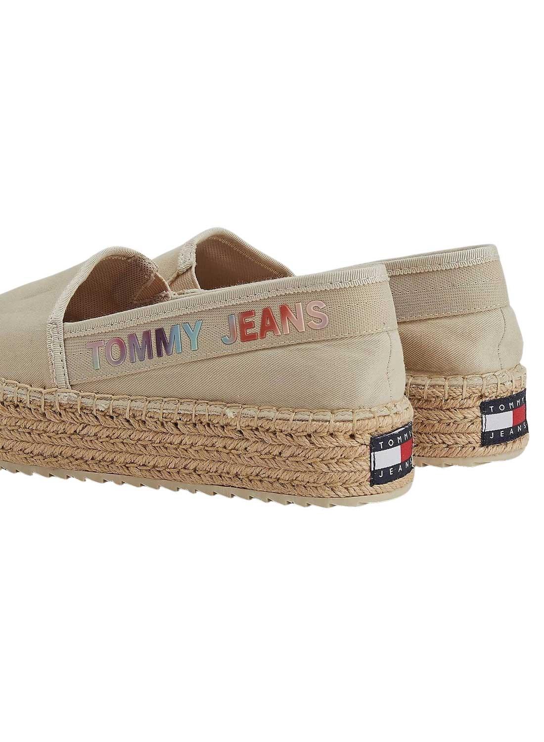Espadrilha Tommy Jeans. Cor bege. Gradiente logotipo multicolorido. Sola de plataforma. Patch de Tommy nas costas. Entressola de juta.