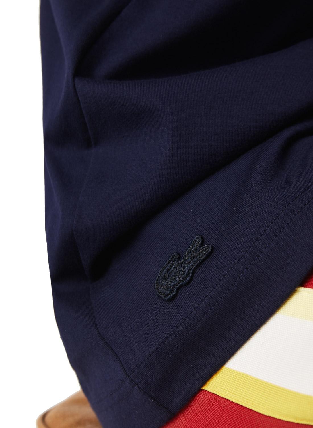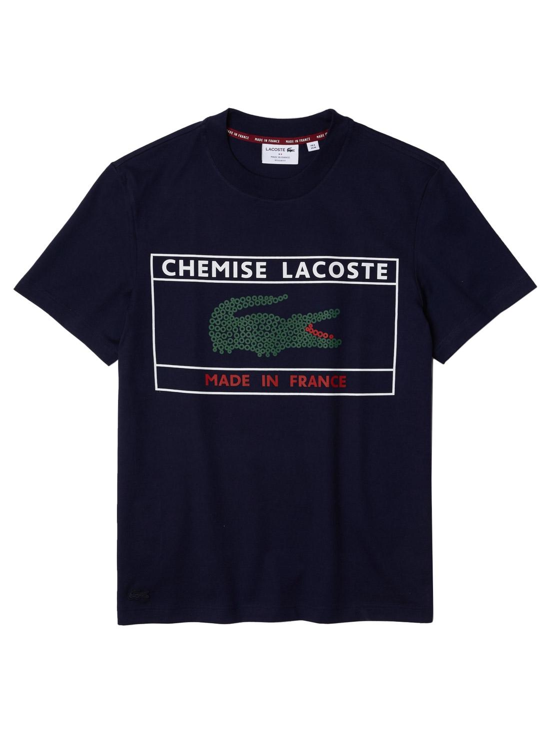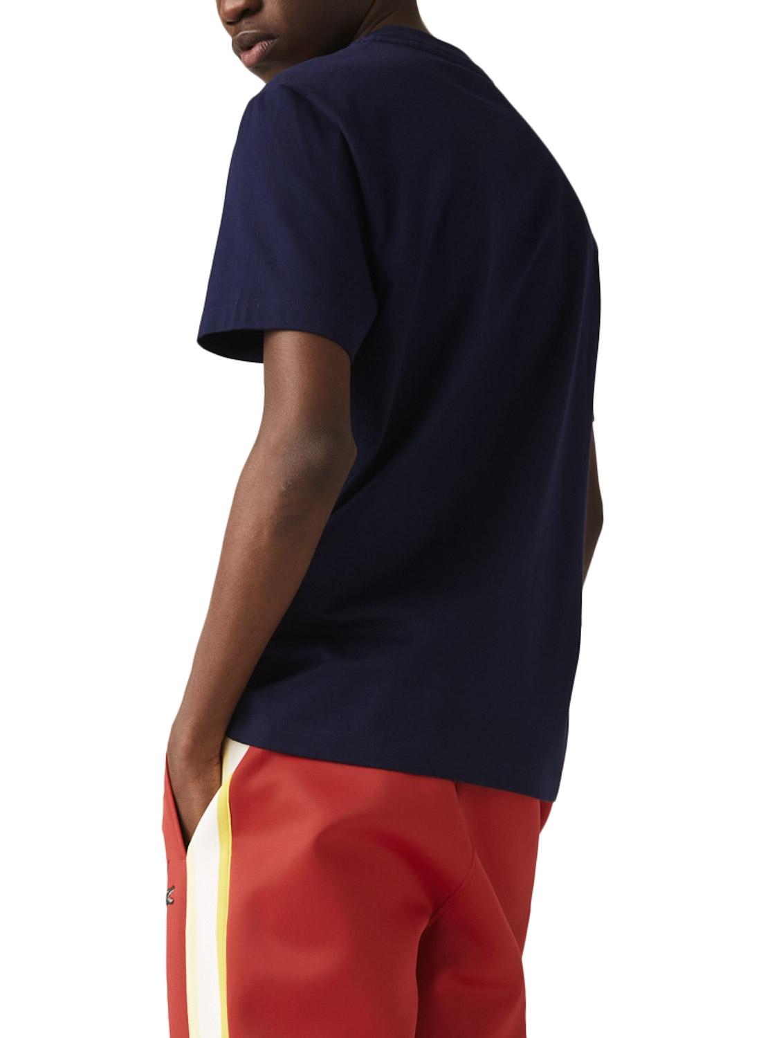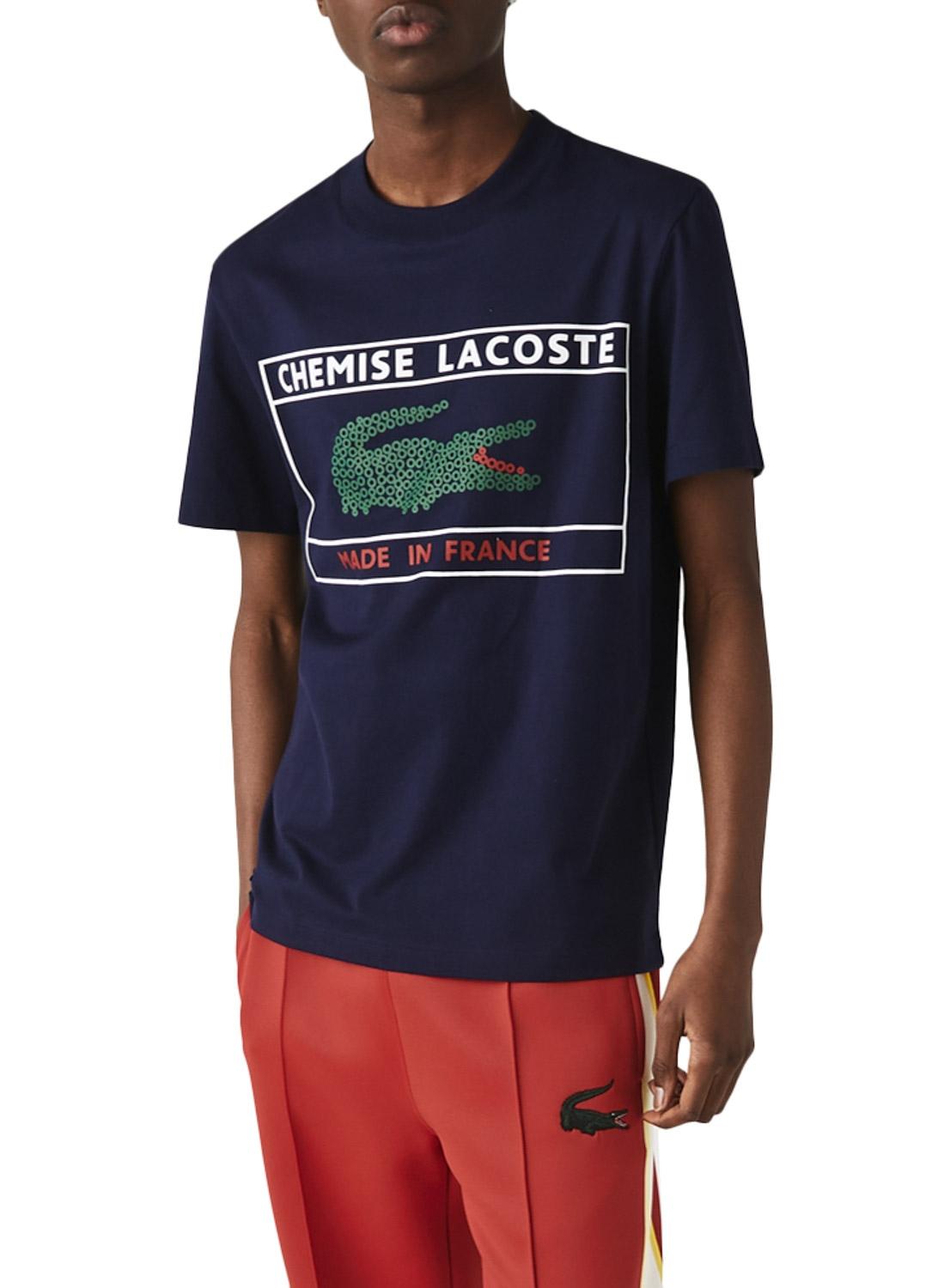 T-Shirt Lacoste. Cor da Marinha. Impressão gráfica com o crocodilo. Manga curta. Gola redonda canelada. Pequeno crocodilo bordado em marinho na parte inferior.