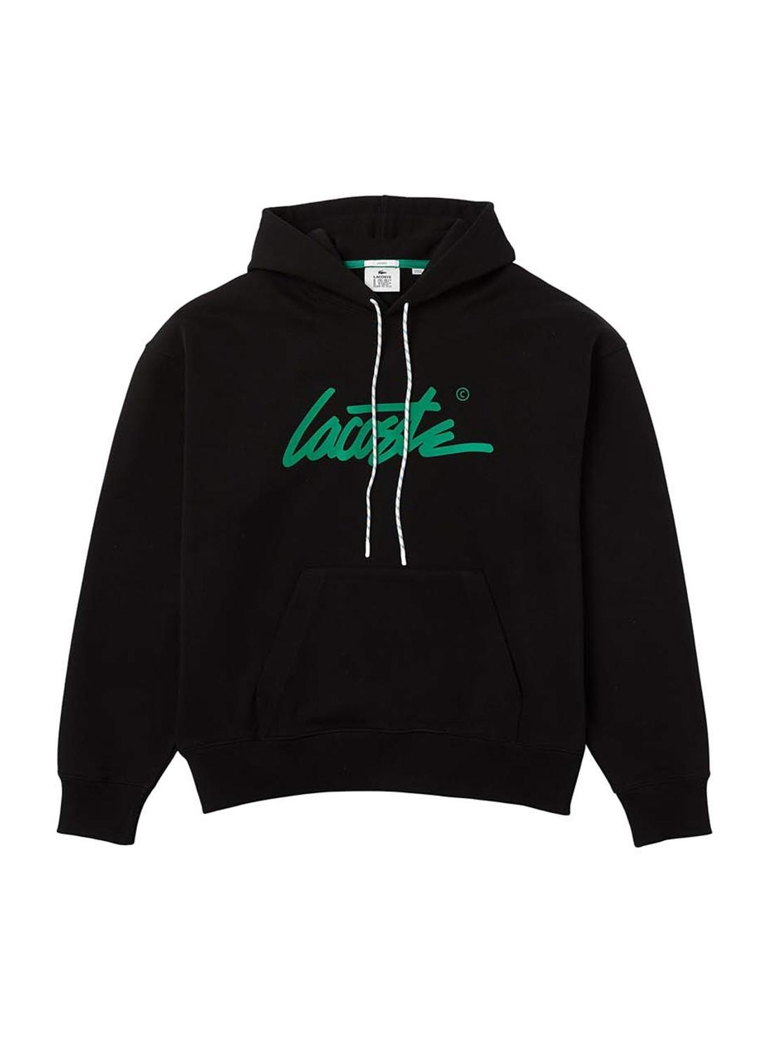Sweat Lacoste. Capuz com atacadores ajustáveis com desenho em ziguezague e costuras visíveis. Ajuste Boxy. Fecho invisível nos bolsos das mangas. para furo do polegar. Detalhes verdes. Crocodilo em borrachado.
