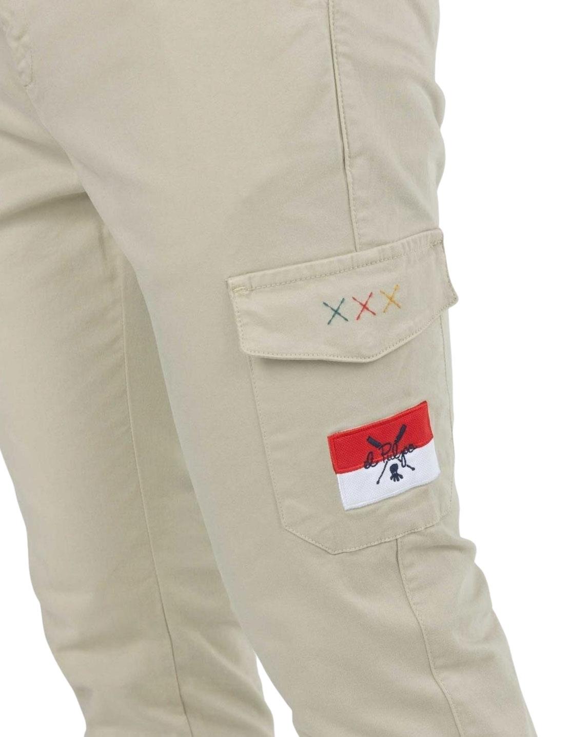 Calças El Pulpo. Cor bege. modelo Cargo. Bolsos nas laterais. Bolsos de aba cargo na coxa. X bordado e patches no bolso cargo. Bolsos traseiros.