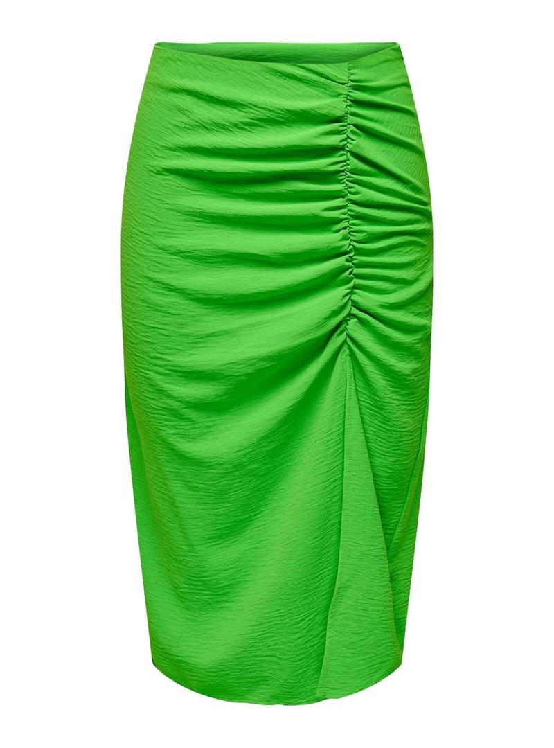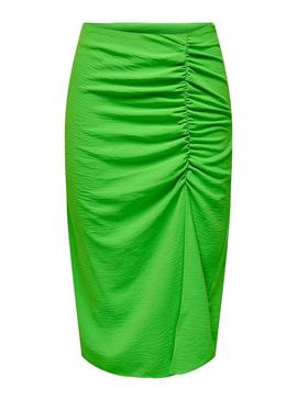 Saia Only. Modelo Meta. Cor verde. High rise. Abertura lateral. Comprimento midi Detalhe franzido no quadril.
