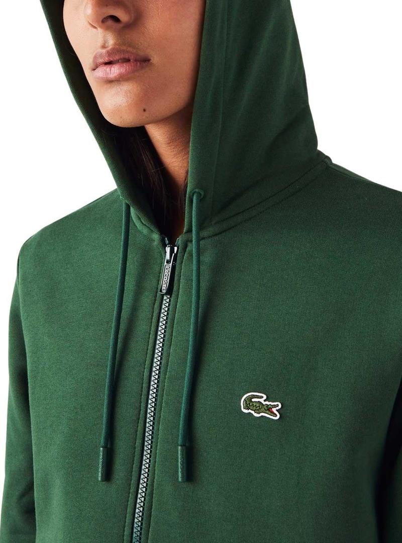 Sweat Lacoste. Fecho com zíper. Cor verde. Capuz com cordão ajustável. Bolsos. Crocodilo bordado. Acabamentos canelados nos punhos e na barra.