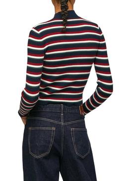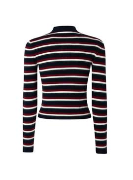 Camisola Pepe Jeans. Canelado com Listras em azul marinho, vermelho e branco. Pescoço de cisne. Tamanho normal Punhos e parte inferior do mesmo tecido. Gola canelada em contraste. Folha de metal na parte inferior