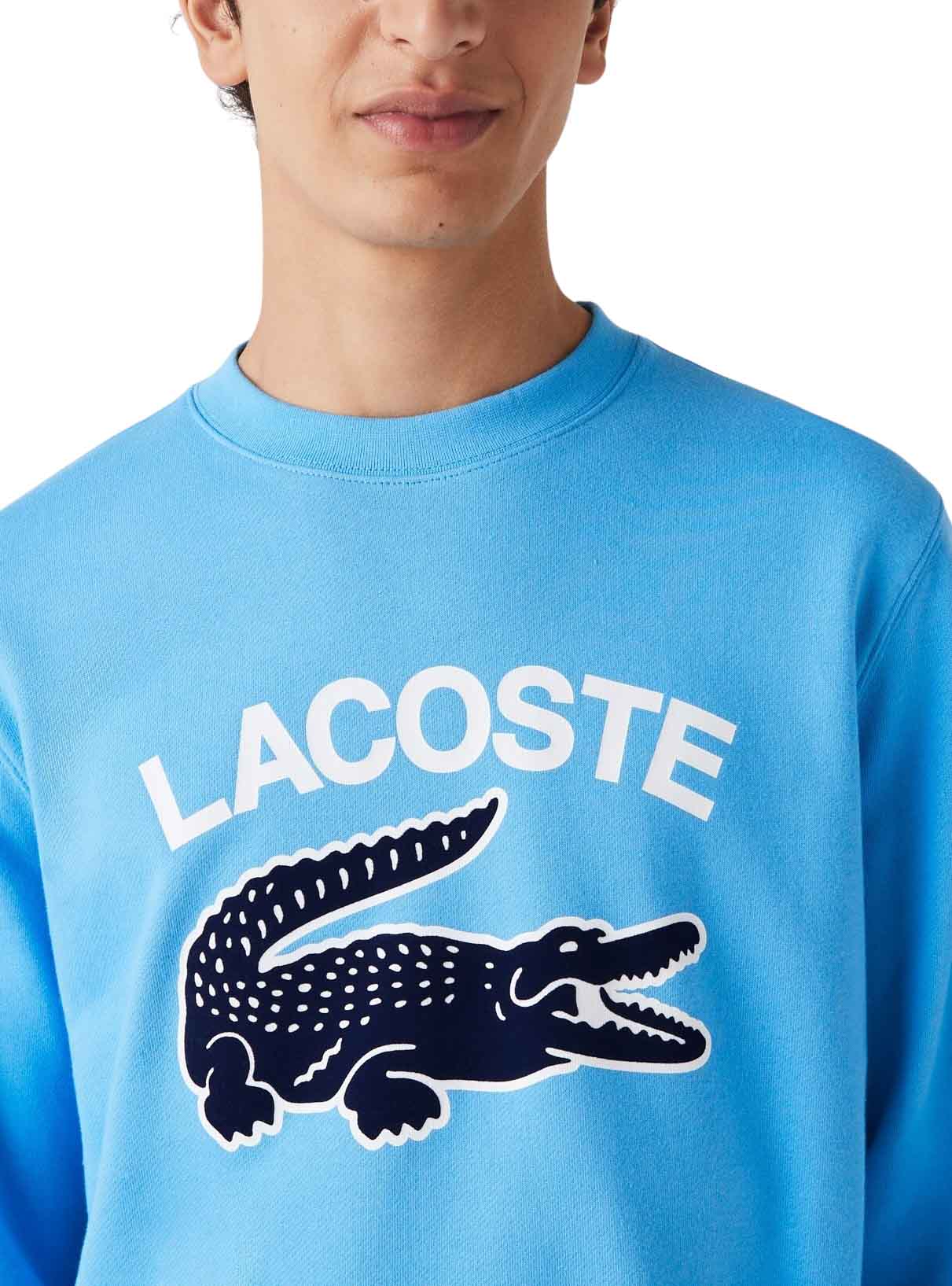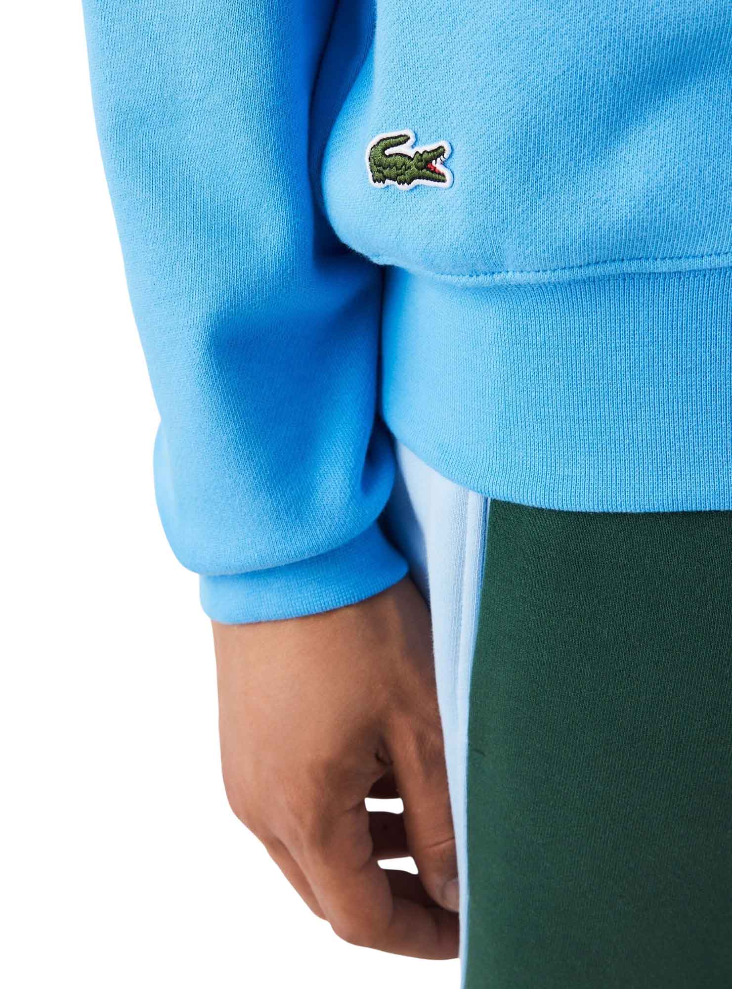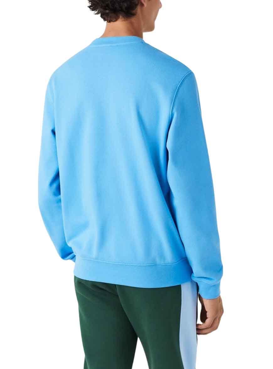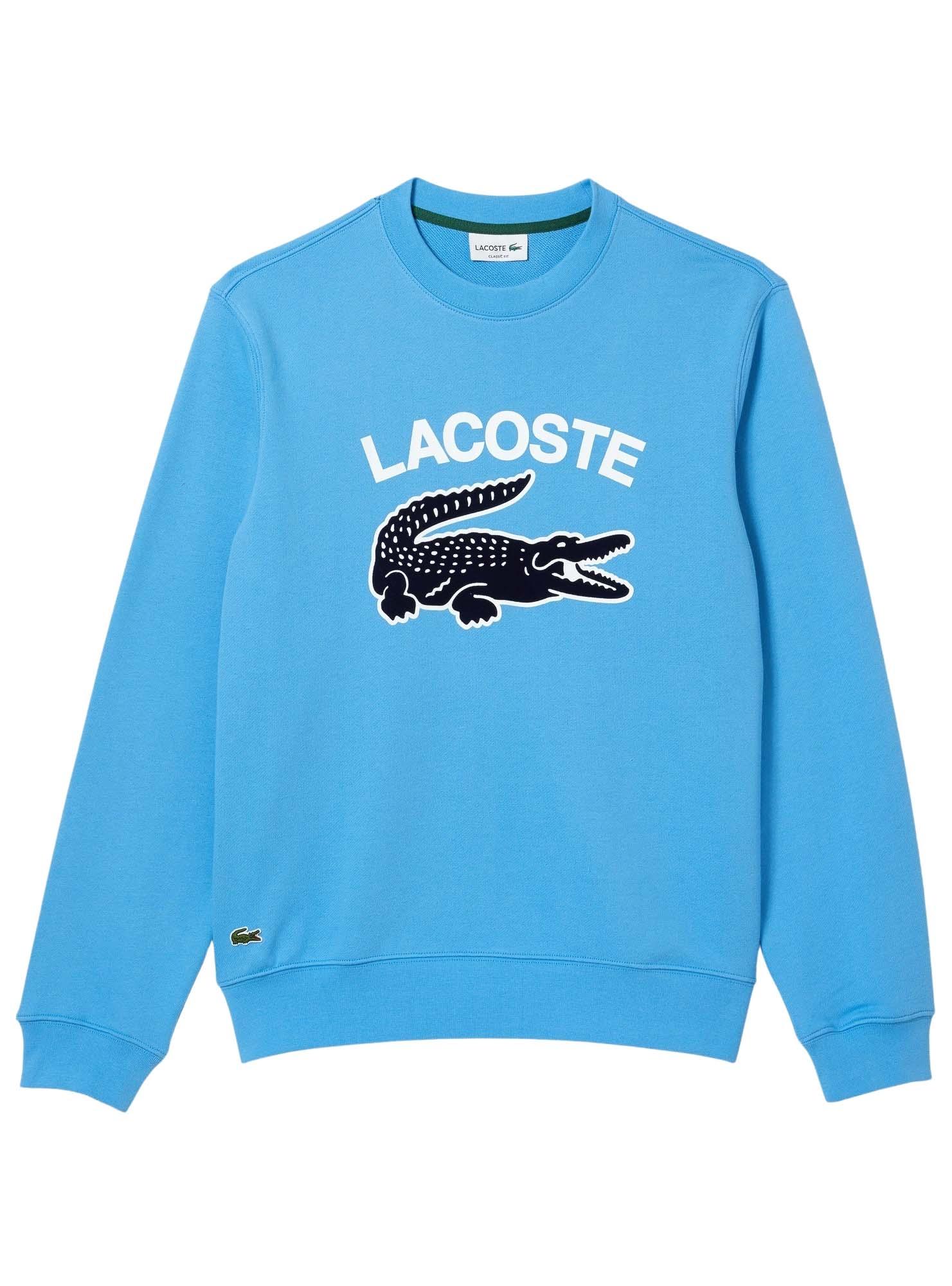 Sweat Lacoste. Crocodilo de tamanho grande contrastante. Cor da Marinha. Barra, gola e punhos canelados. Crocodilo verde na parte inferior. Pescoço redondo.