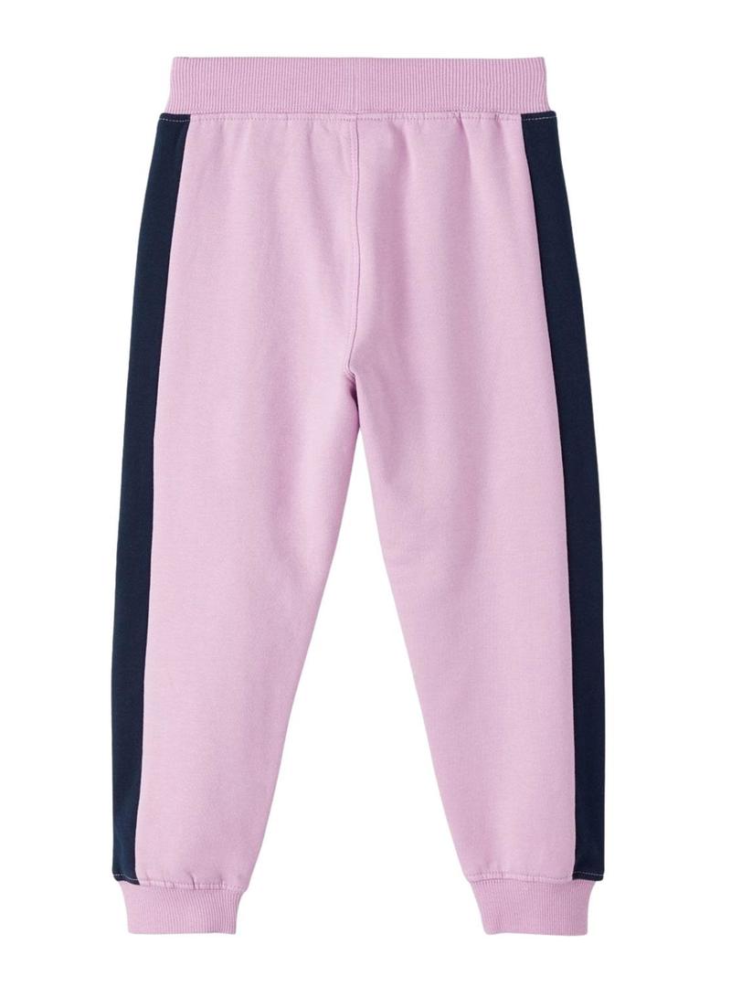 Calças Name It. Cor malva. Modelo Lark. Faixas laterais em bege e marinho. Cintura com borracha ajustável. Cordão marinho contrastante na cintura. sem bolsos Cintura e barra caneladas. Mensagem na perna.