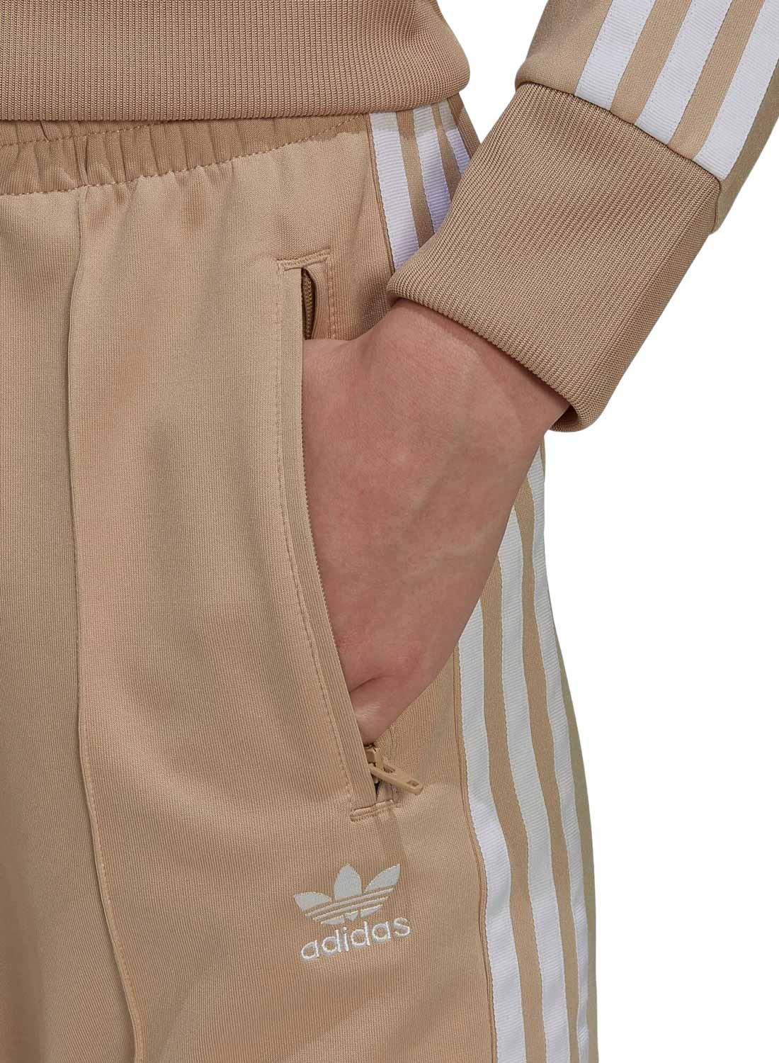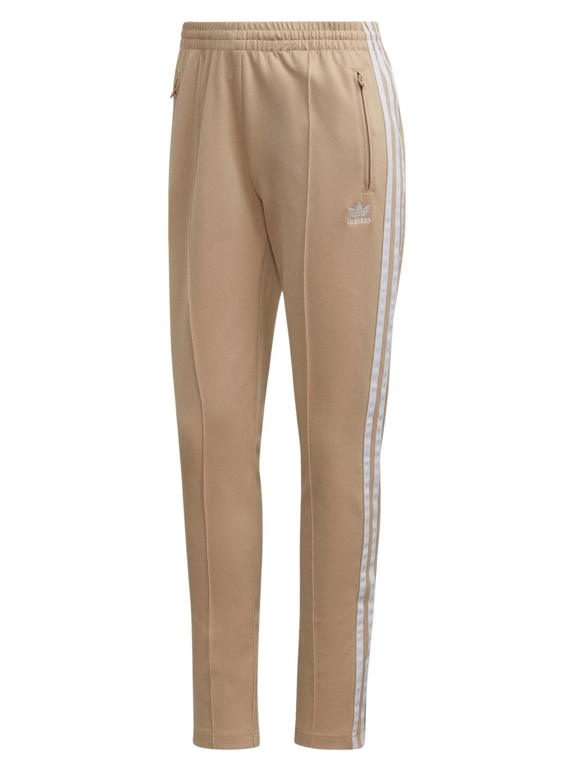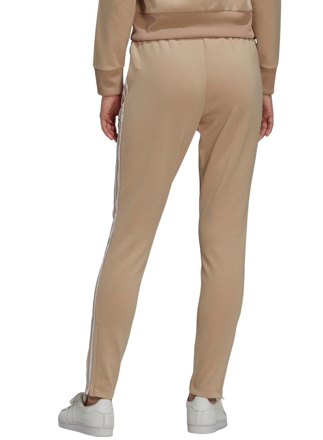 Calças Adidas. Cor bronzeada. Ajuste fino. Cintura ajustável borracha com cordões. 3 bandas laterais. Bolsos laterais com zíper. Feito com Primeblue, um tecido reciclado de alta performance. A modelo veste tamanho 36.