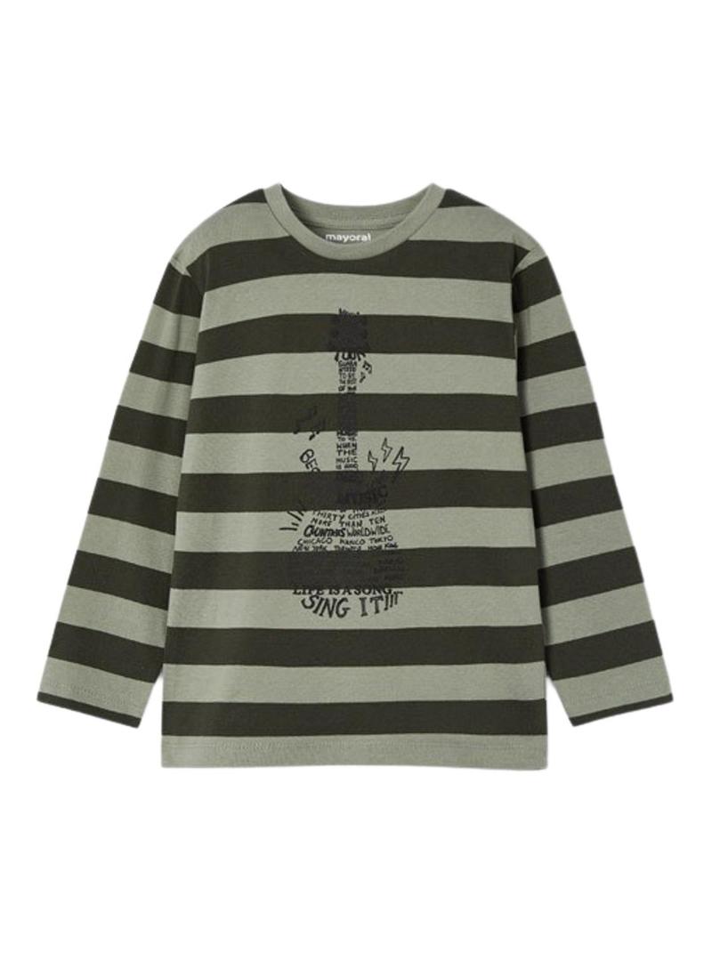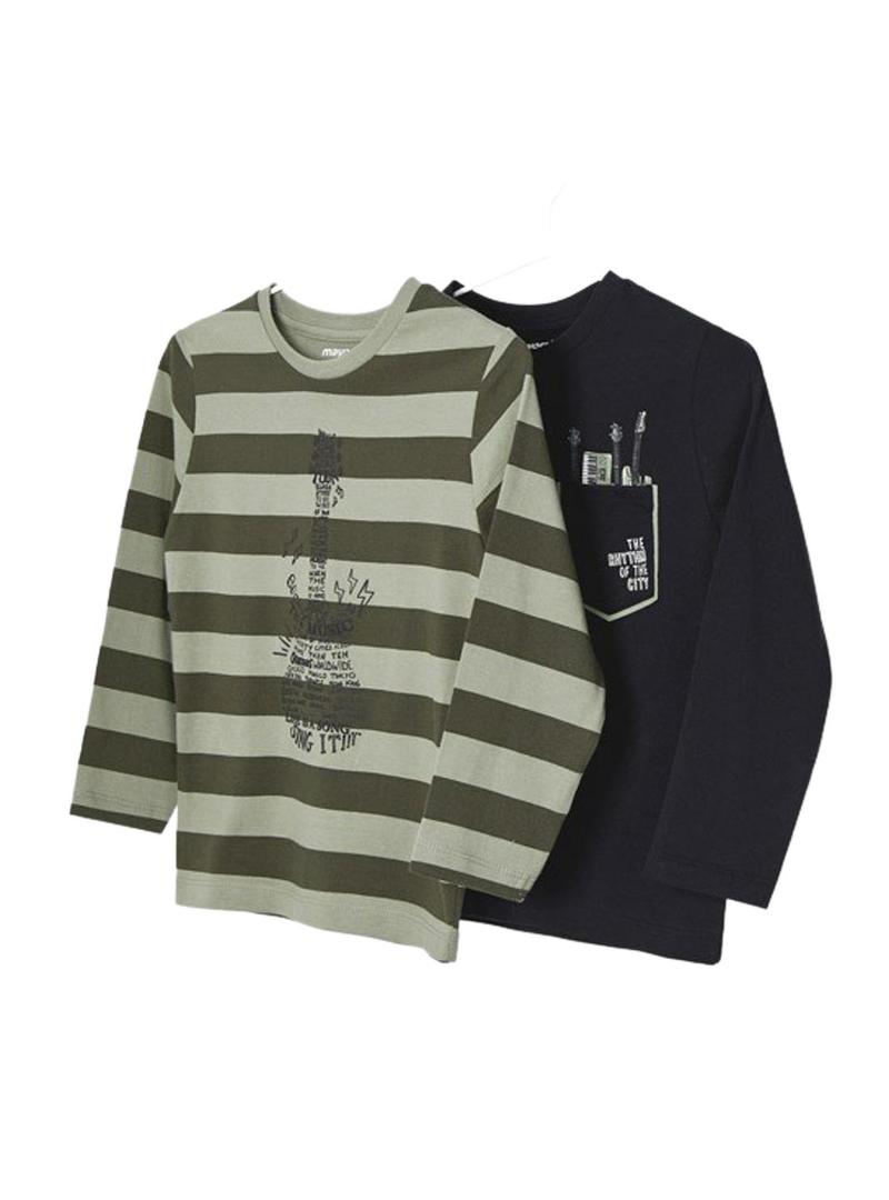 Set 2 T-Shirts Mayoral. CoolBand. T-Shirt manga comprida em preto. Pescoço redondo. Estampado no bolso do peito. T-Shirt cinza esverdeado com padrão de Listras. Manga longo. Desenho de uma guitarra feita de palavras.