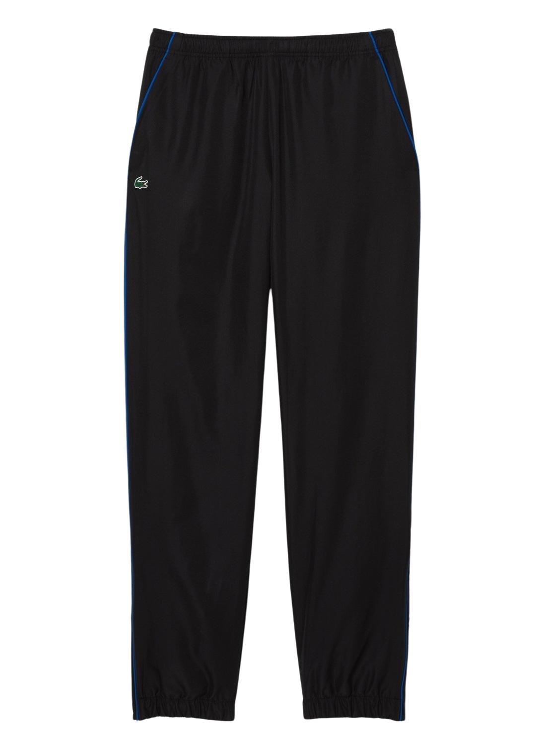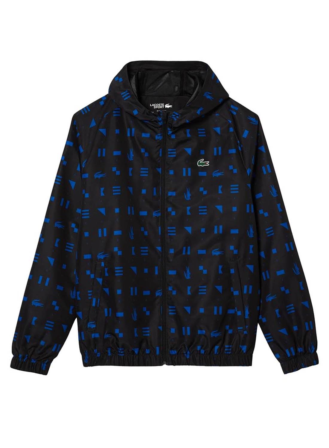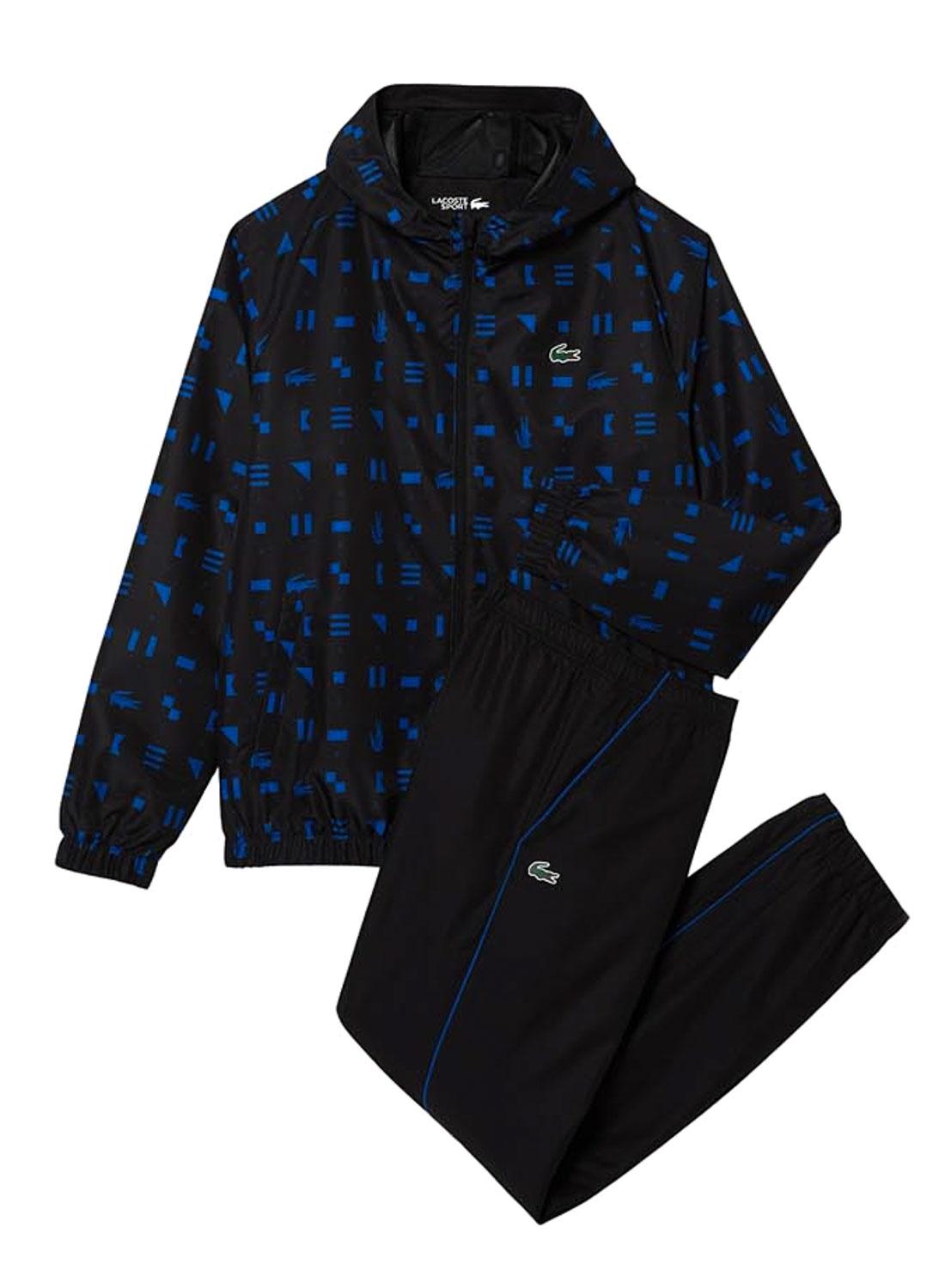 Treino Lacoste Sport. cor preta. Calças preto. Cintura e punhos elásticos. Banda lateral marinha. Casaca preto. Crocodilo verde bordado. Contraste geométrico Printed. Com capuz. Fecho com zíper.