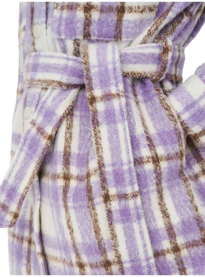 Casaca-Camisa Only. Modelo Hannah. Com estampa xadrez. Colorway roxo e branco. Dois bolsos com aba no peito. Fechamento por cinto e botão.