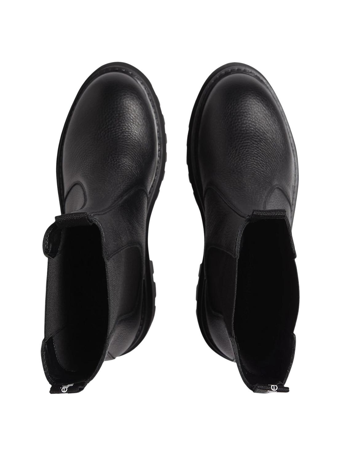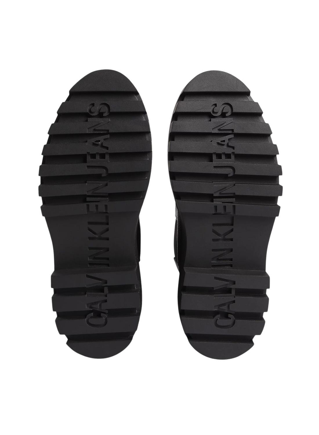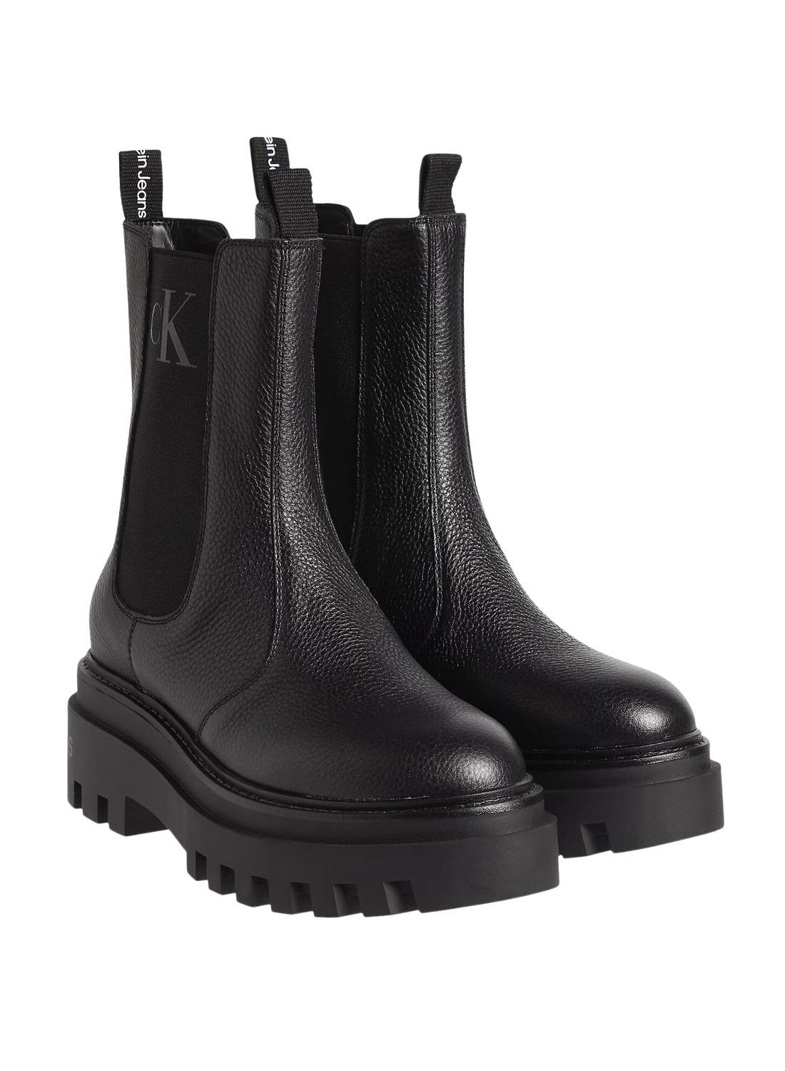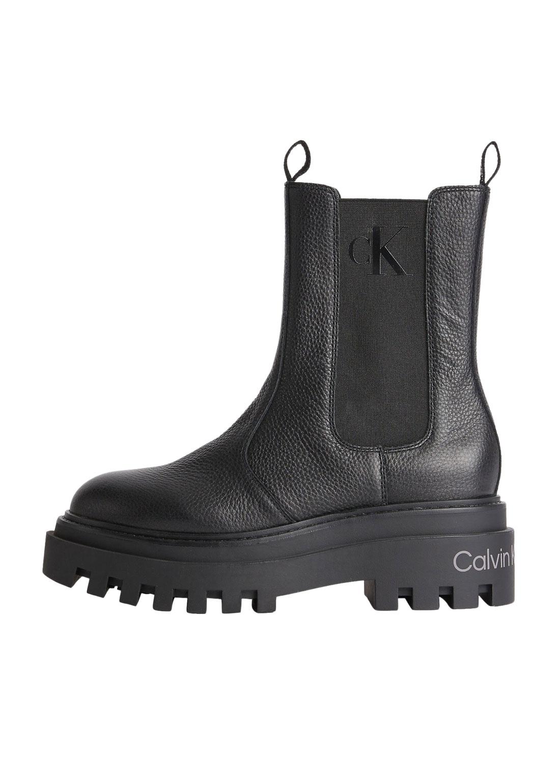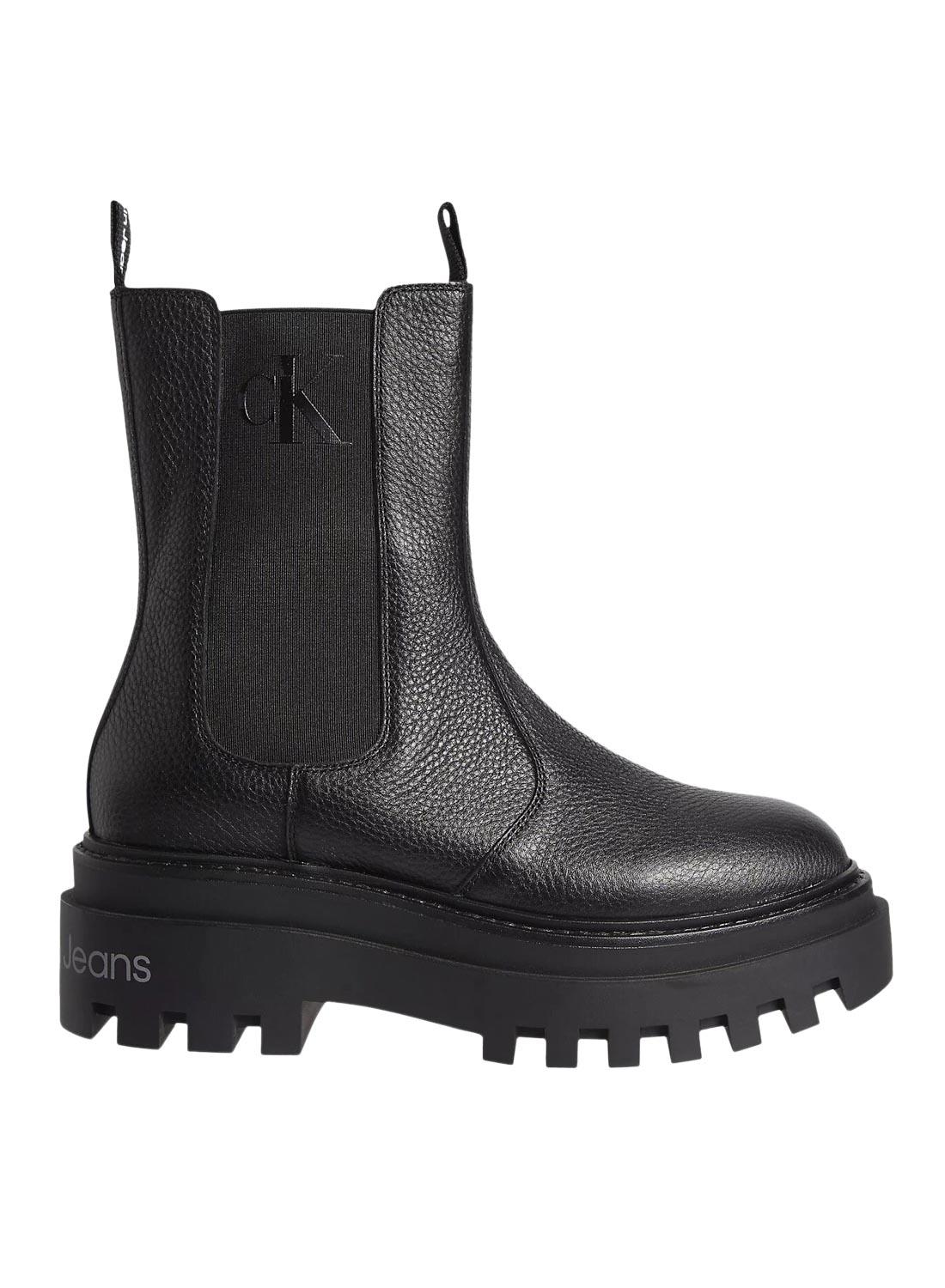 Botas Calvin Klein. cor preta. Haste média de 18,5 cm. Elástico nas laterais. Atirador frente e verso. Sola de camionista de 6 cm. Parte de cima com couro macio e manchado. Inserções elásticas com o logotipo do monograma no mesmo tom.