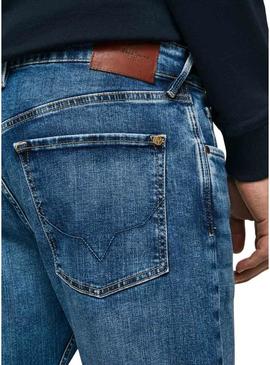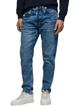 Jeans Pepe Jeans. Fit Relaxado. cintura Regular. Tapeperna vermelha. Cor azul. Tecido jeans. Lavagem índigo claro. estilo de 5 bolsos. mid rise. Etiqueta traseira.