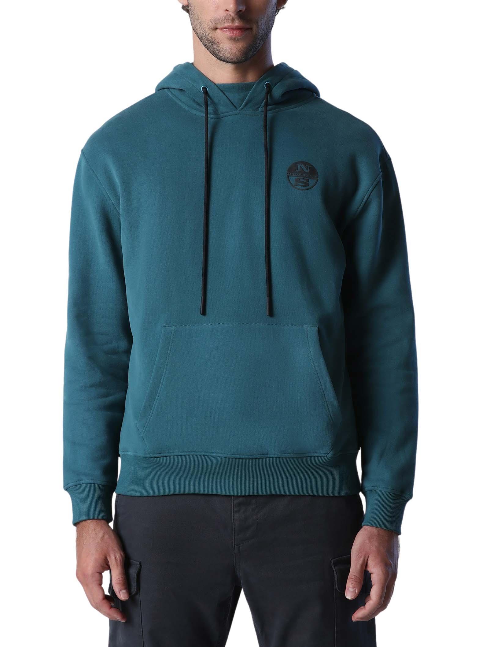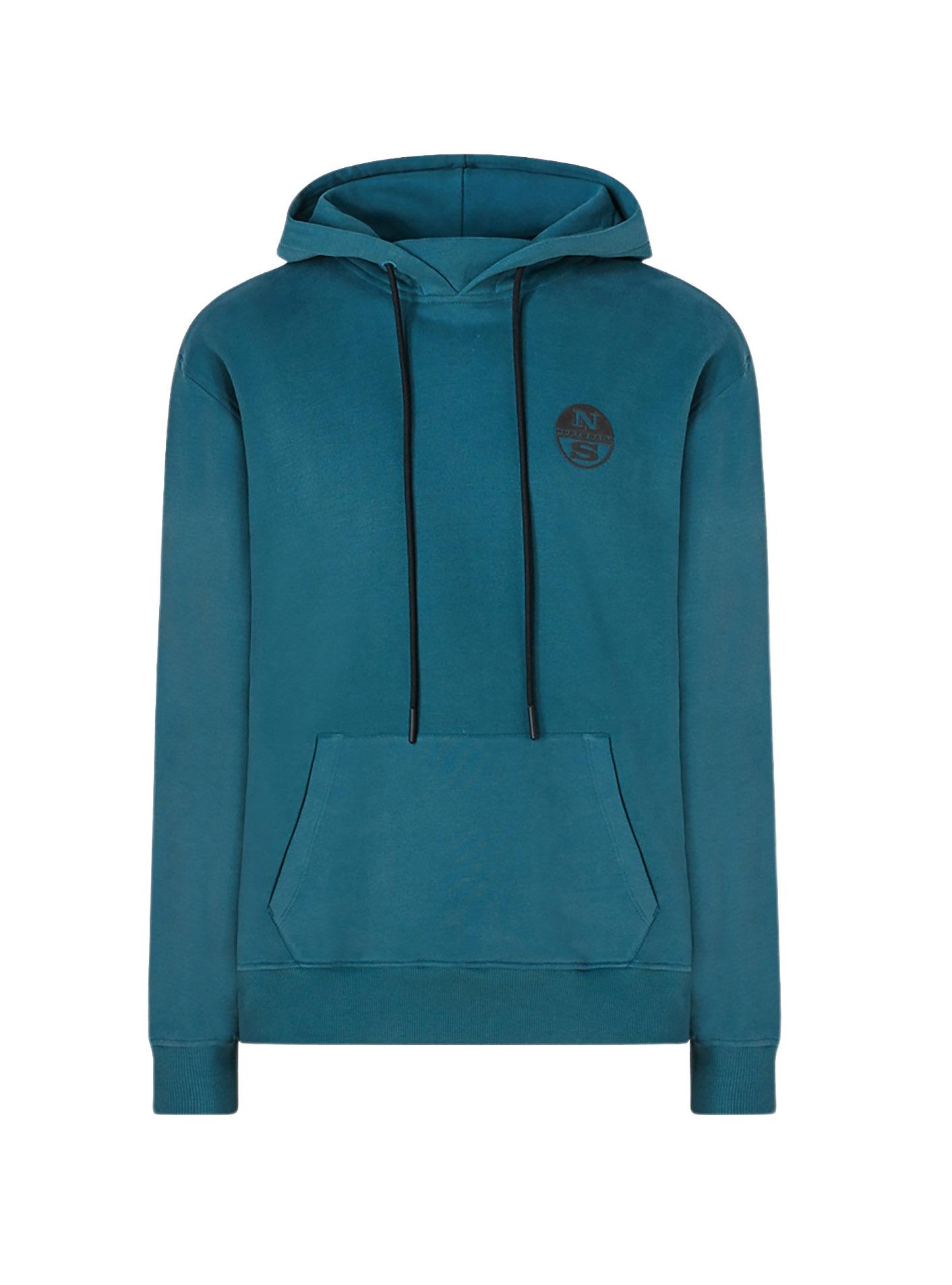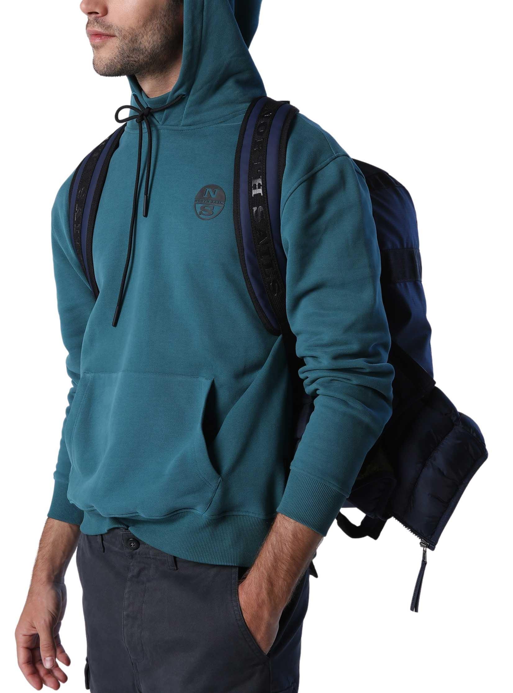 Sweat North Sails para homem. Cor azul gasolina. Capuz com cabo. Extremidades elásticas. Pequeno logótipo no peito. Desenho gráfico impresso nas costas.