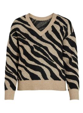Camisola Vila. Cor preto e bege. Zebra Printed. Modelo viril. Gola V. Extremidades elásticas caneladas em bege.
