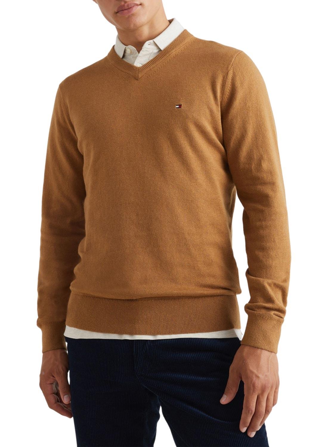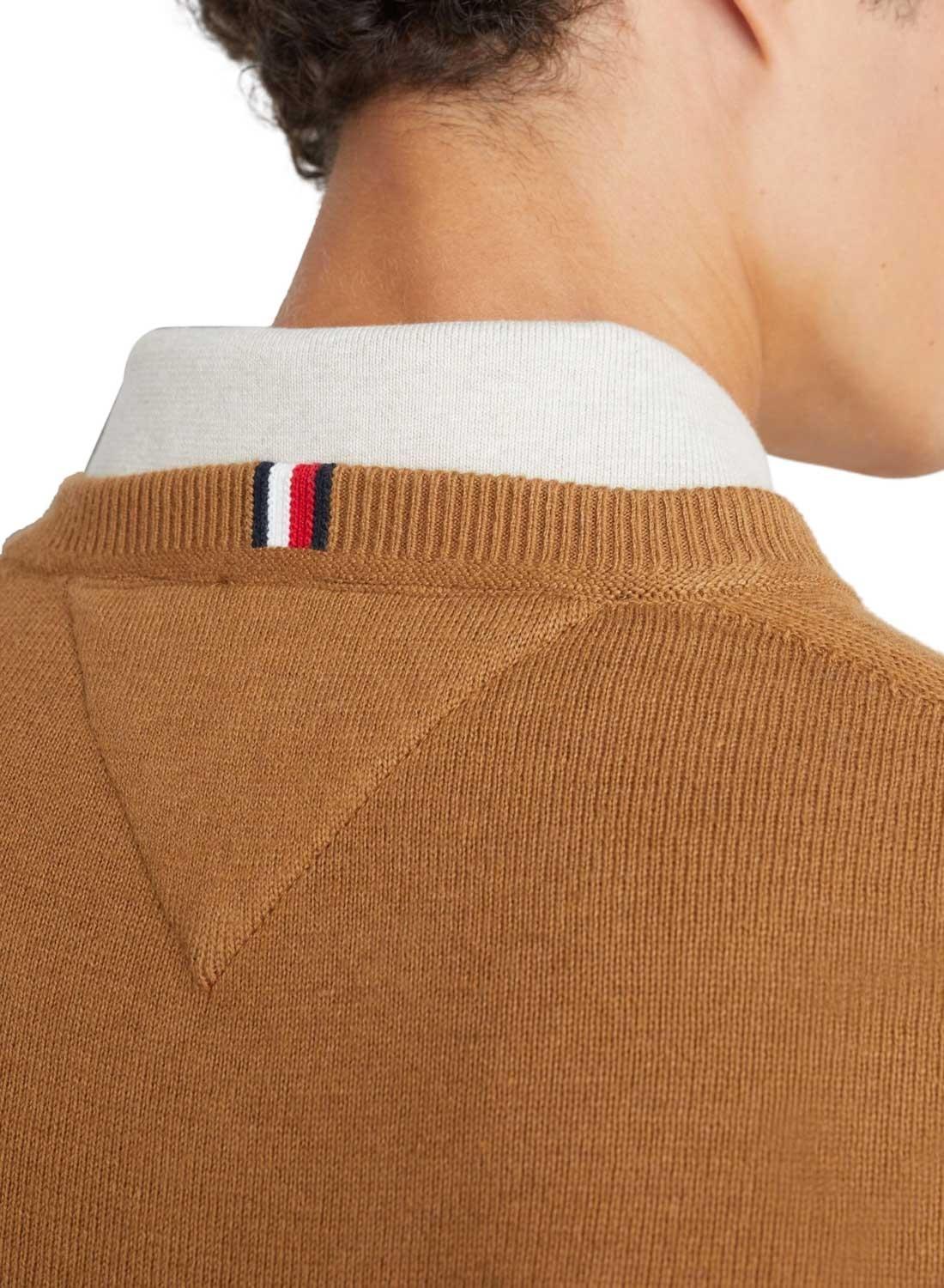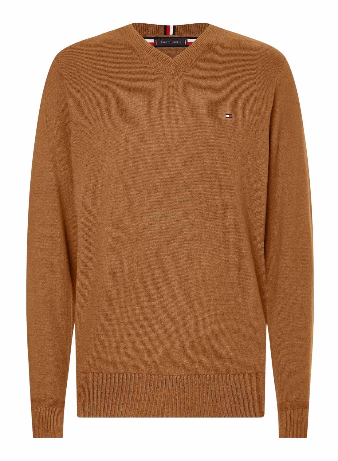 Camisola Tommy Hilfiger para homem. Cor camel. Gola V. Elástico canelado nas pontas. Bandeira bordada no peito e pescoço. Algodão pima orgânico e mistura de caxemira. Corte normal.