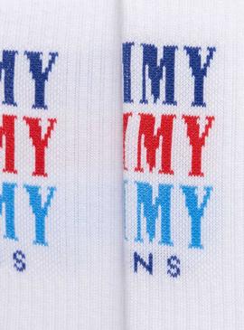 Maias Tommy Hilfiger para mulher e homem. Design de corte alto. Logo em três cores. Faixa no dedo do pé. Cor branco. Tecido elástico em mistura de algodão orgânico.