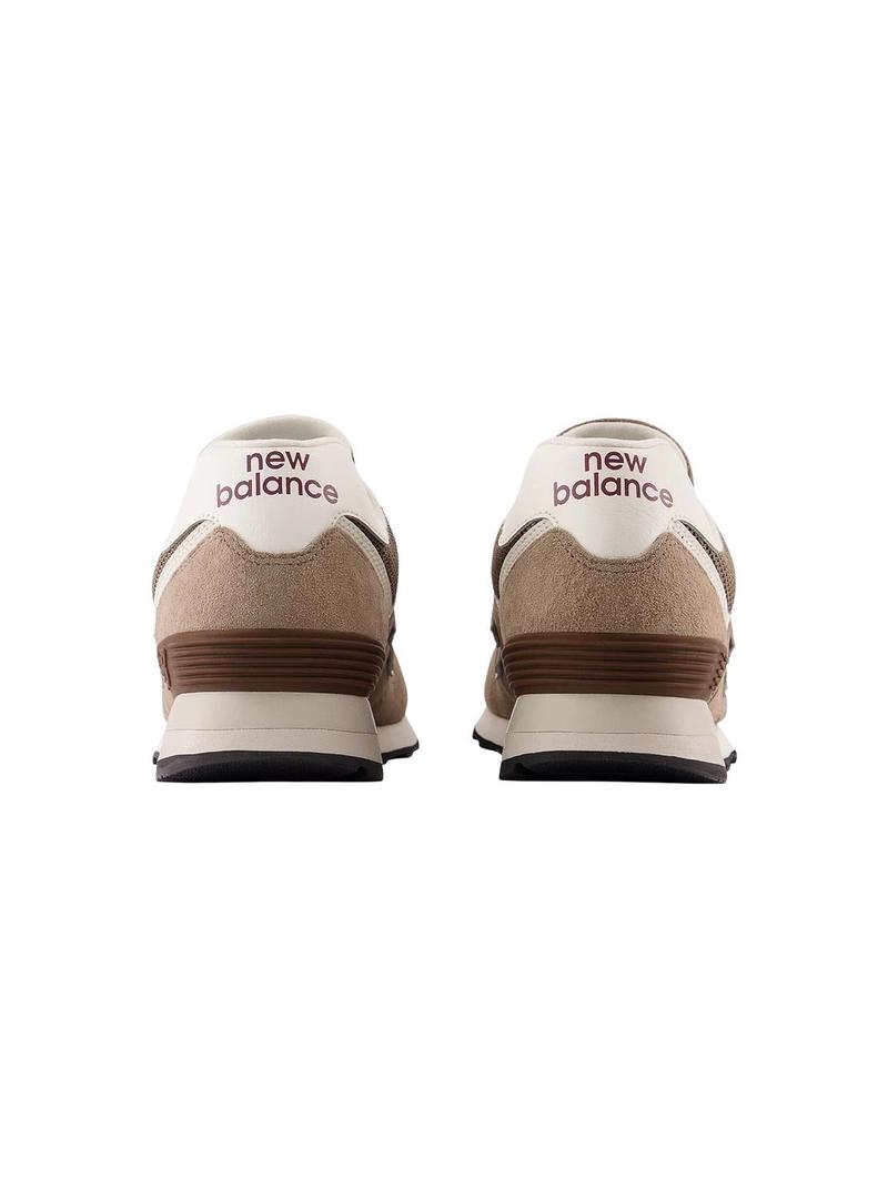 Sapatilhas New Balance. Modelo 574. Cor bege. Fechamento em cadarço. Logo lateral. Biqueira redonda reforçada. Solado em fibra sintética. Forro com estofamento contra o frio.