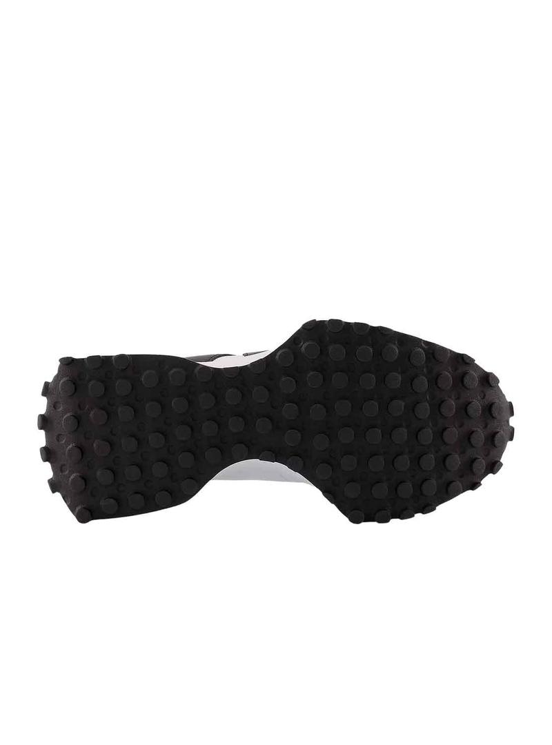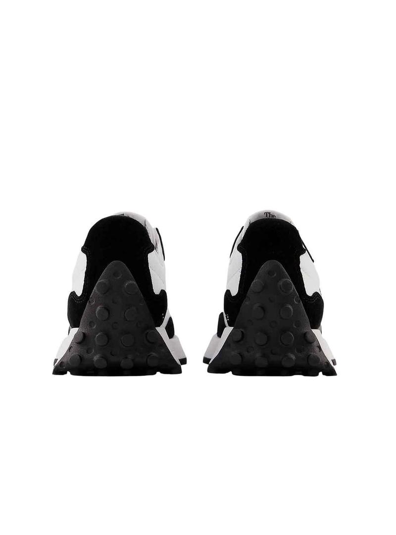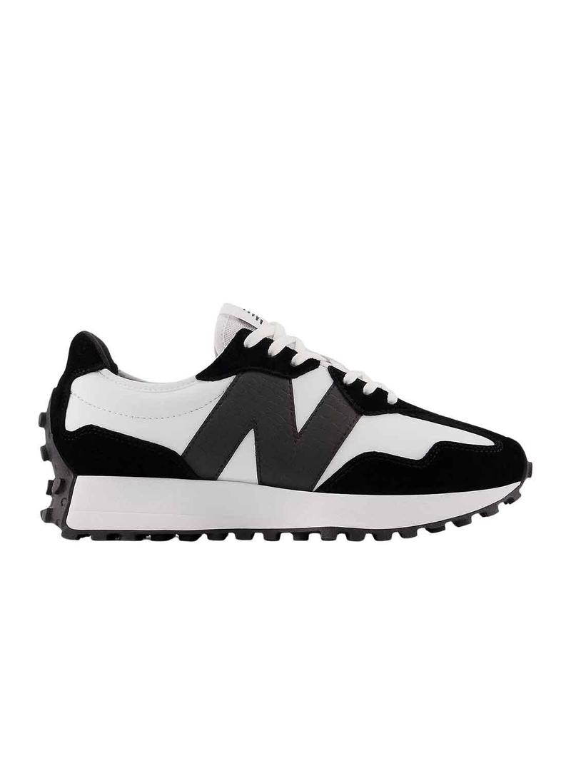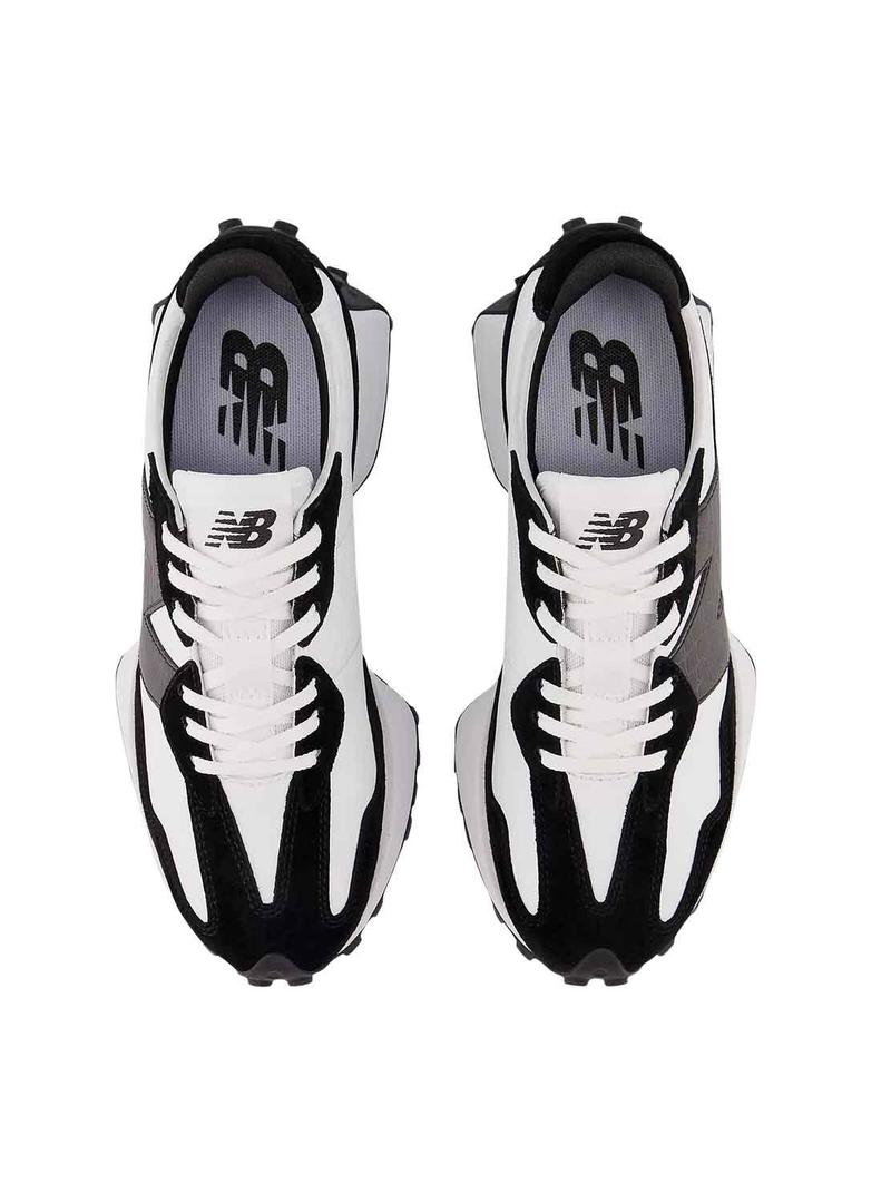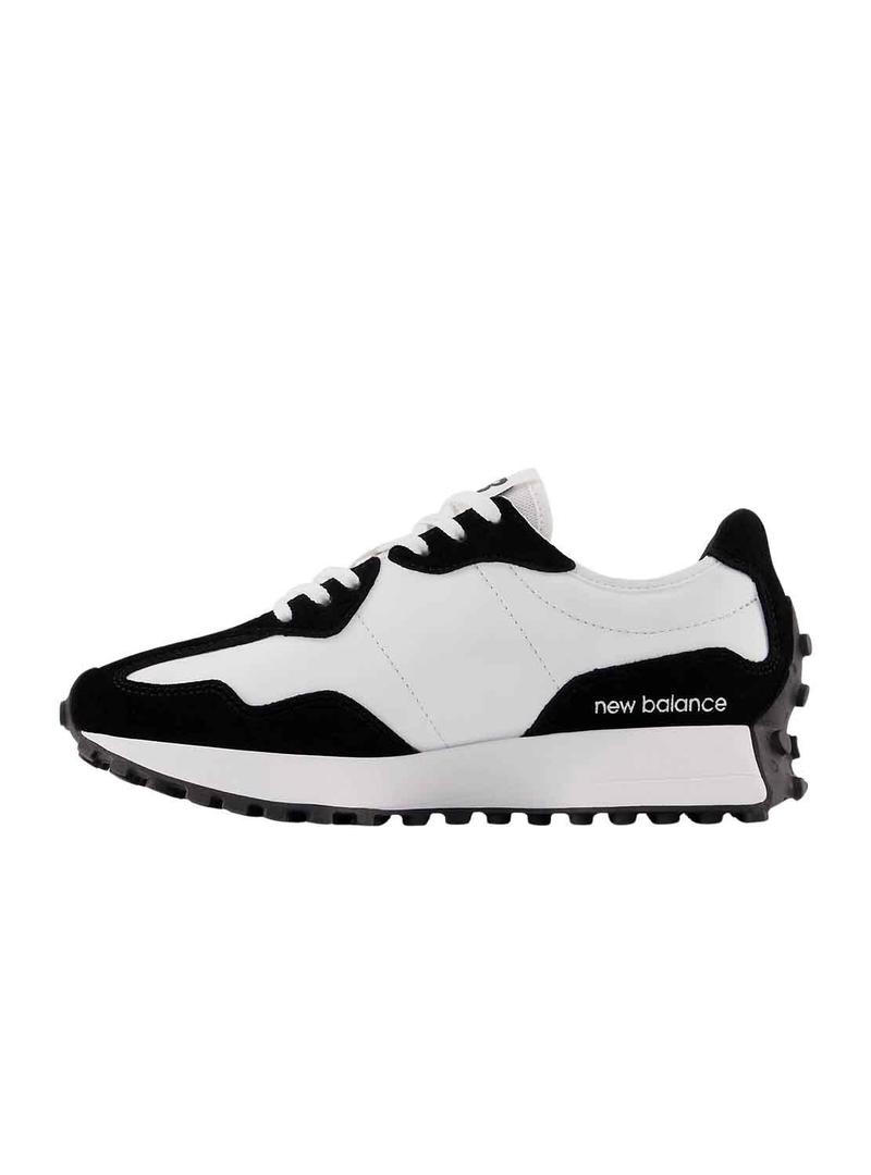 Sapatilhas New Balance. Modelo 327. Cor branco. Painéis pretos. Fechamento em cadarço. Sola serrilhada. Biqueira e calcanhar reforçados. Logo lateral em cinza.