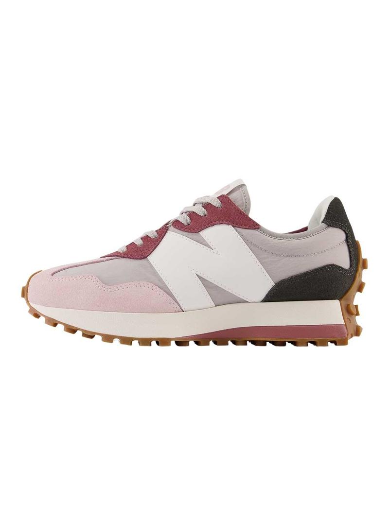 Sapatilhas New Balance. Modelo 327. Cor rosa e cinza. Logo lateral branco. Fechamento em cadarço. Painéis de camurça. Biqueira e calcanhar reforçados.