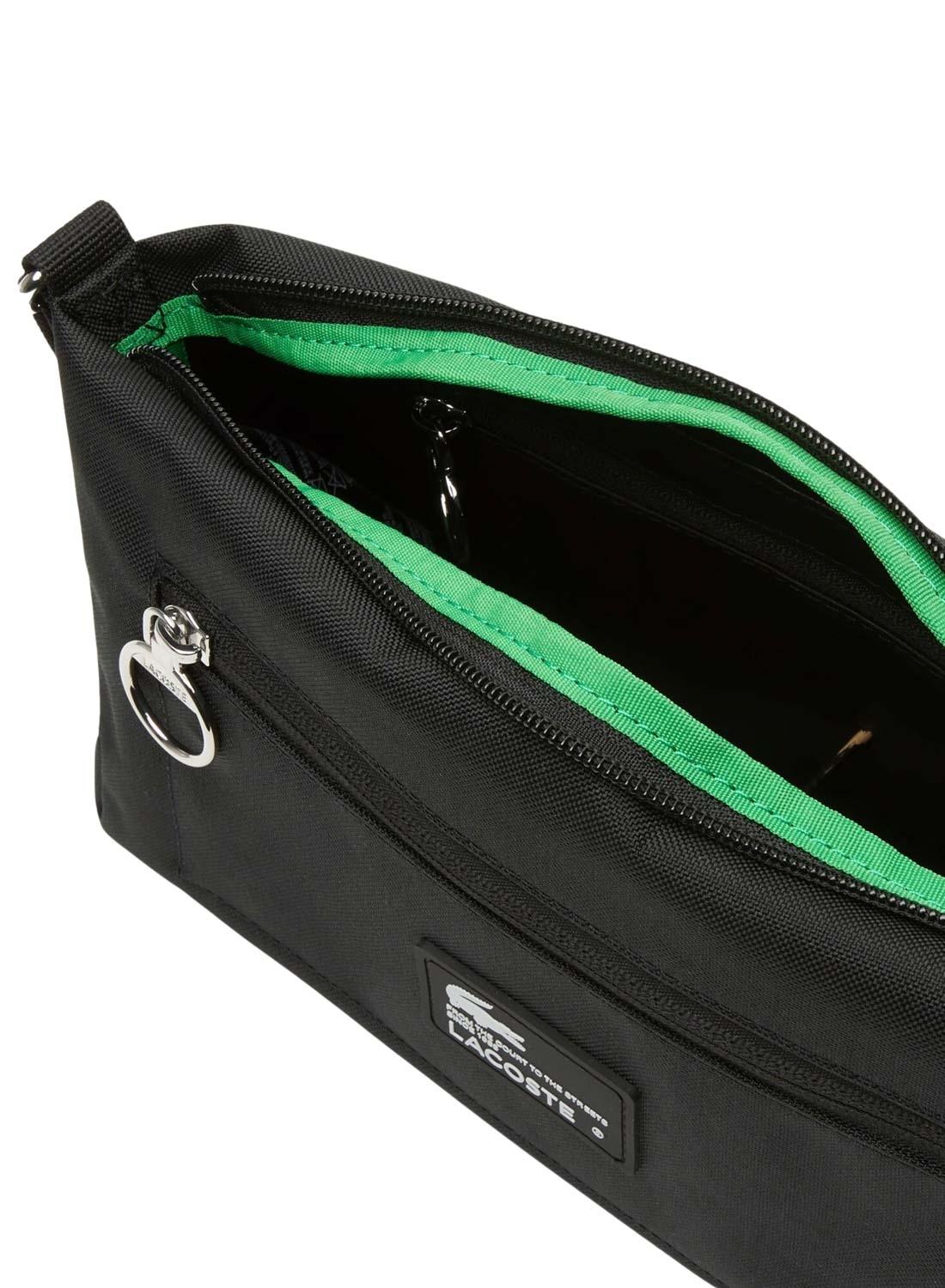 Bolsa Lacoste moderno. Bolsa modelo Crossover. Cor preto. logotipo do centro. Alça regulável de 100 cm. Um bolso externo com zíper. Um bolso interno com zíper. Exterior em poliéster.