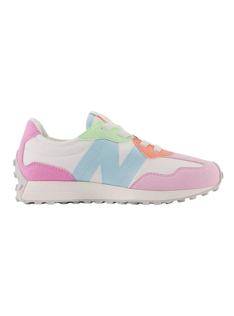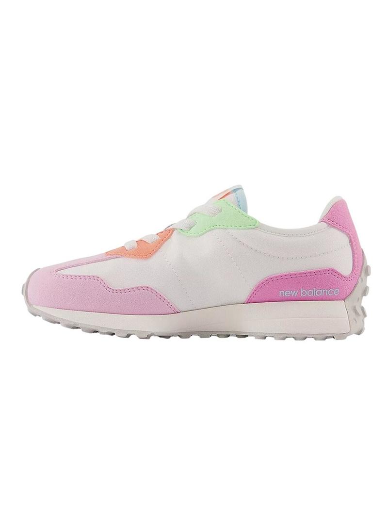 Sapatilhas New Balance. Modelo 327. Cor branco. Detalhe da marca N na lateral. Detalhes em várias cores. Reforço borracha no calcanhar. Fechamento em cadarço.