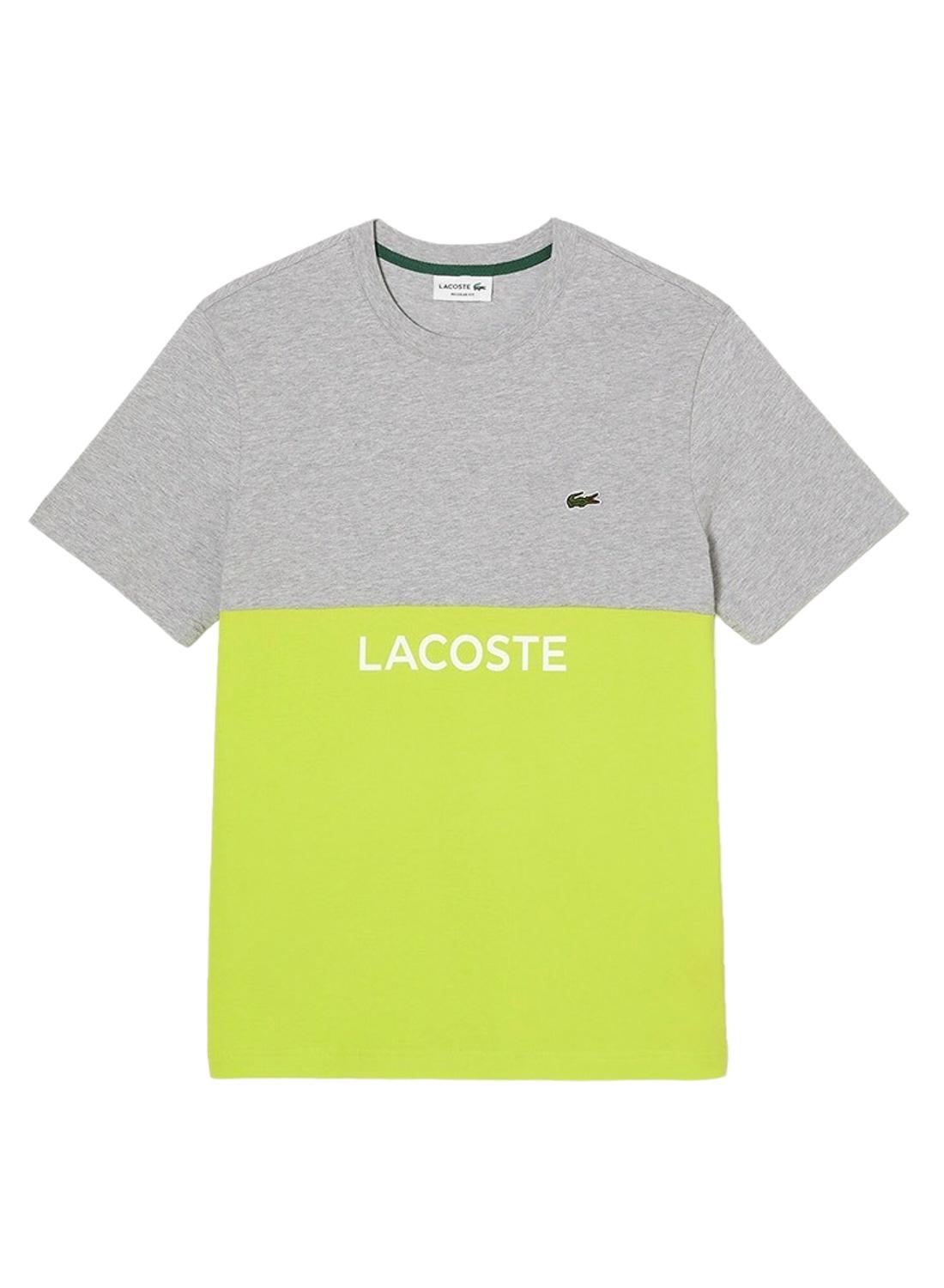T-Shirt Lacoste. Modelo TH8372. Bloco cinza e amarelo manchado Cor. Manga curto. Logotipo bordado. Pescoço redondo. Corte regular fit. Tecido de malha de algodão.
