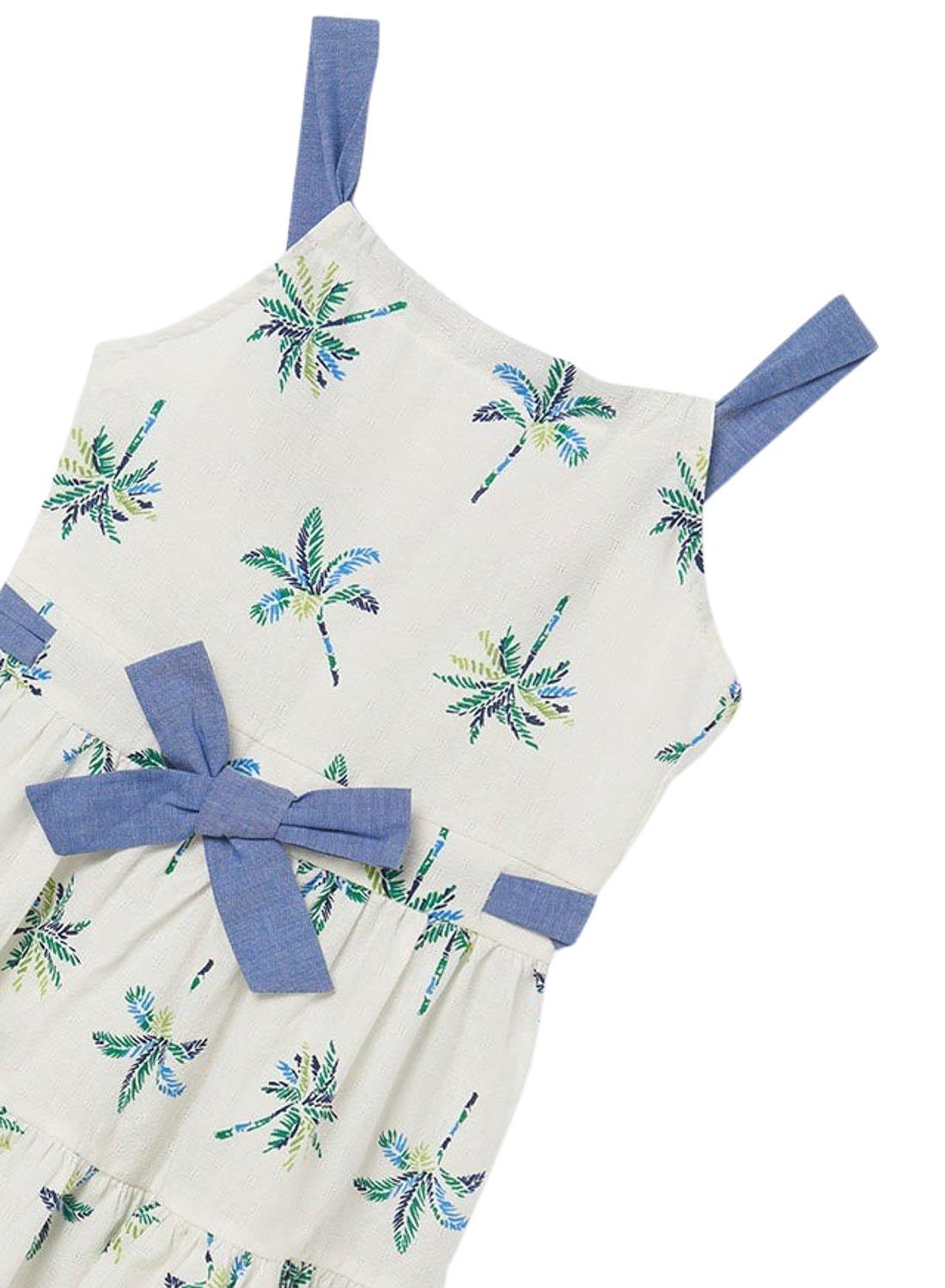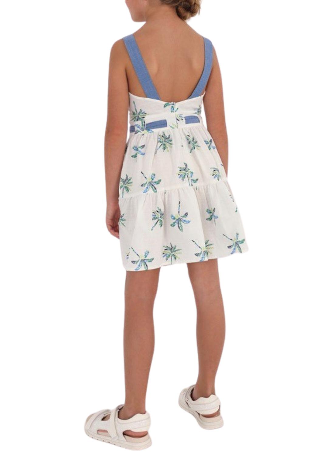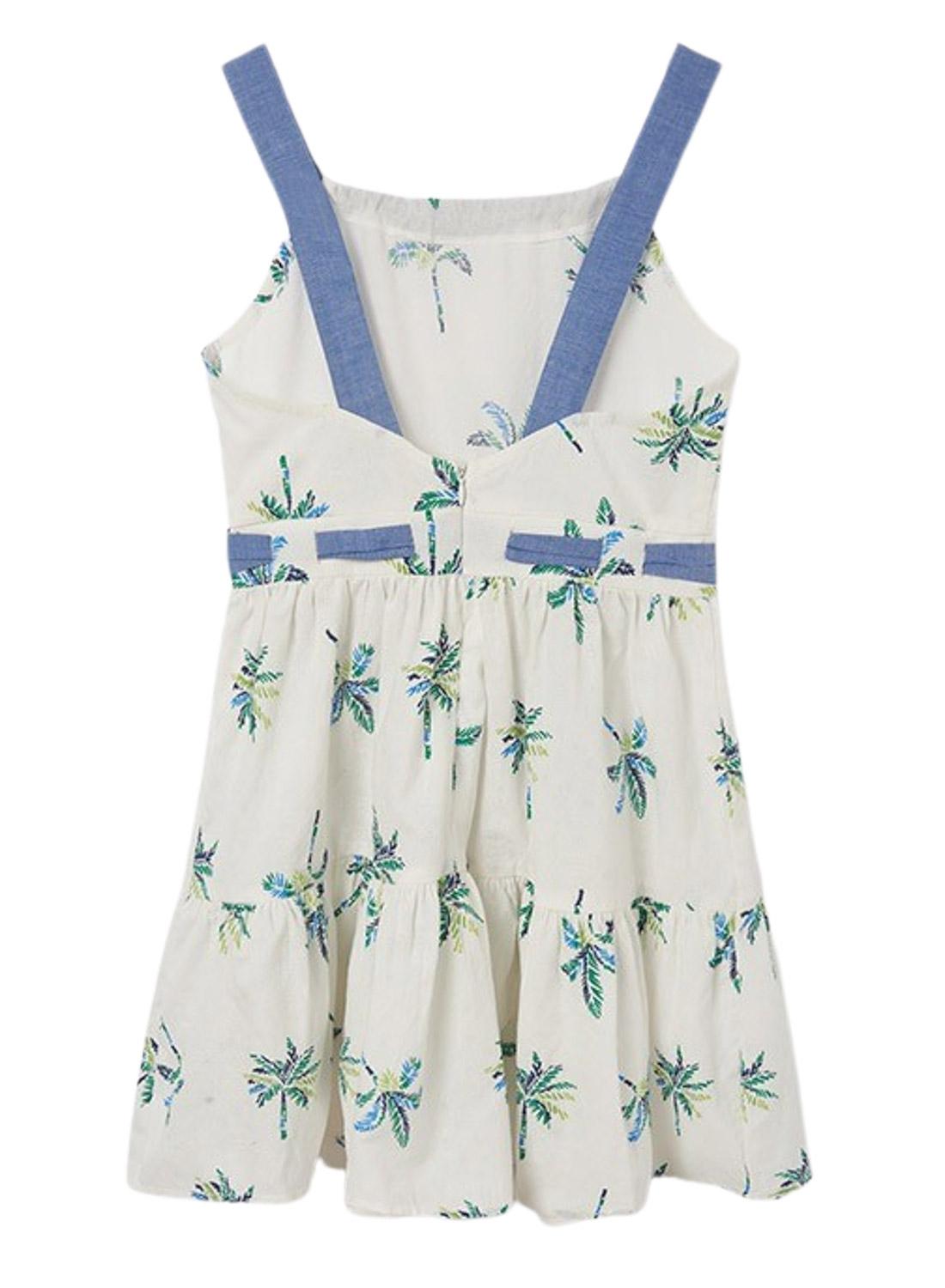 Vestido Mayoral. Printed de palmeiras. cintura ajustada Suspensórios. Pescoço redondo. Abertura nas costas.