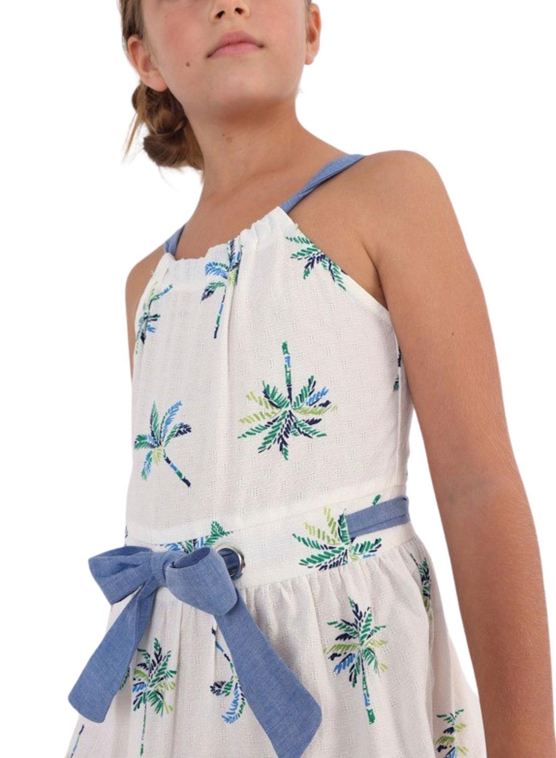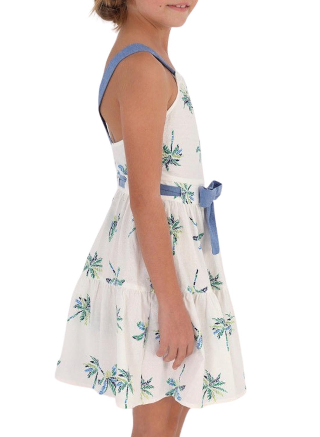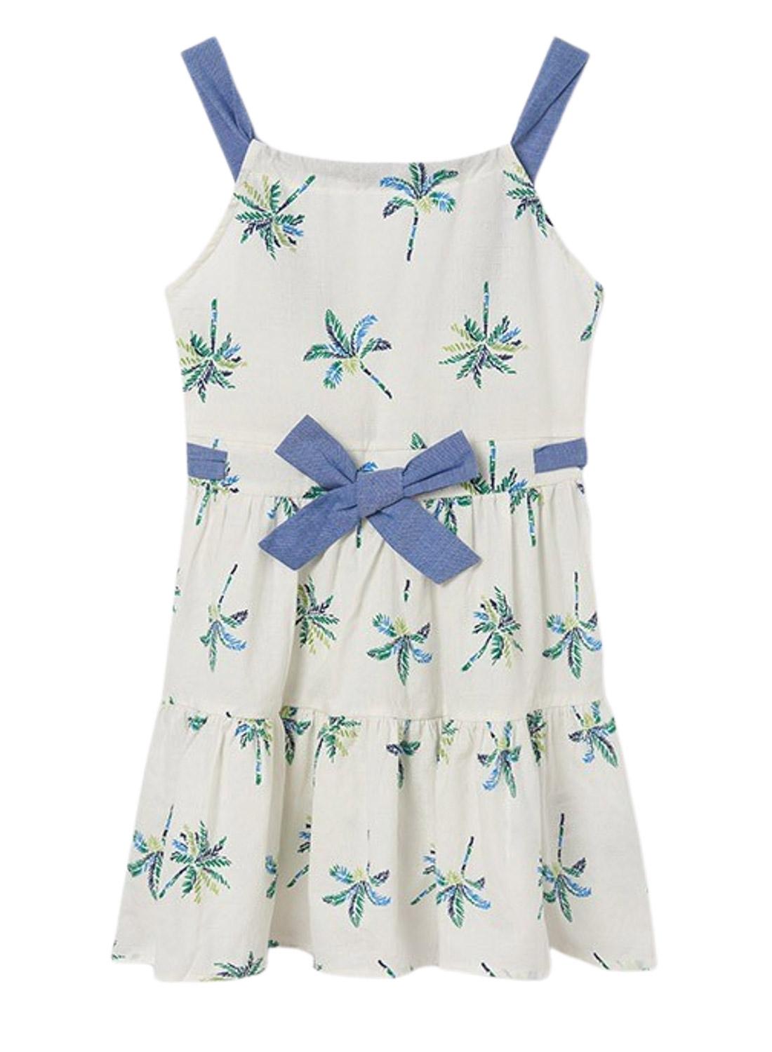 Vestido Mayoral. Printed de palmeiras. cintura ajustada Suspensórios. Pescoço redondo. Abertura nas costas.