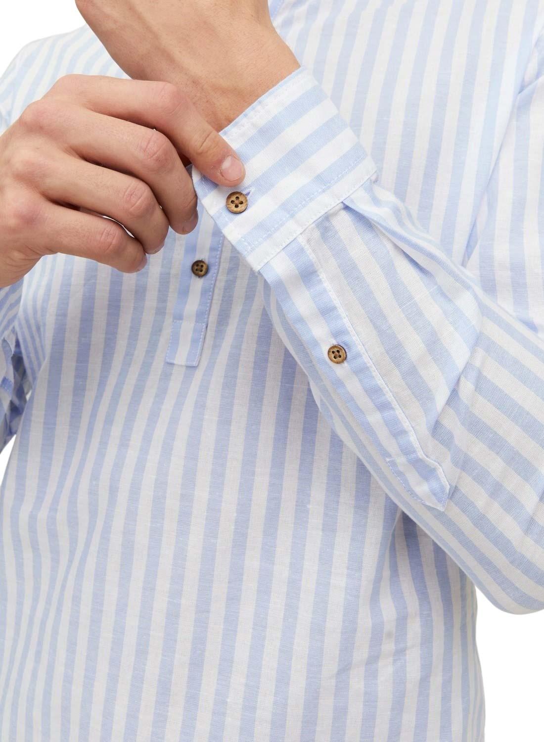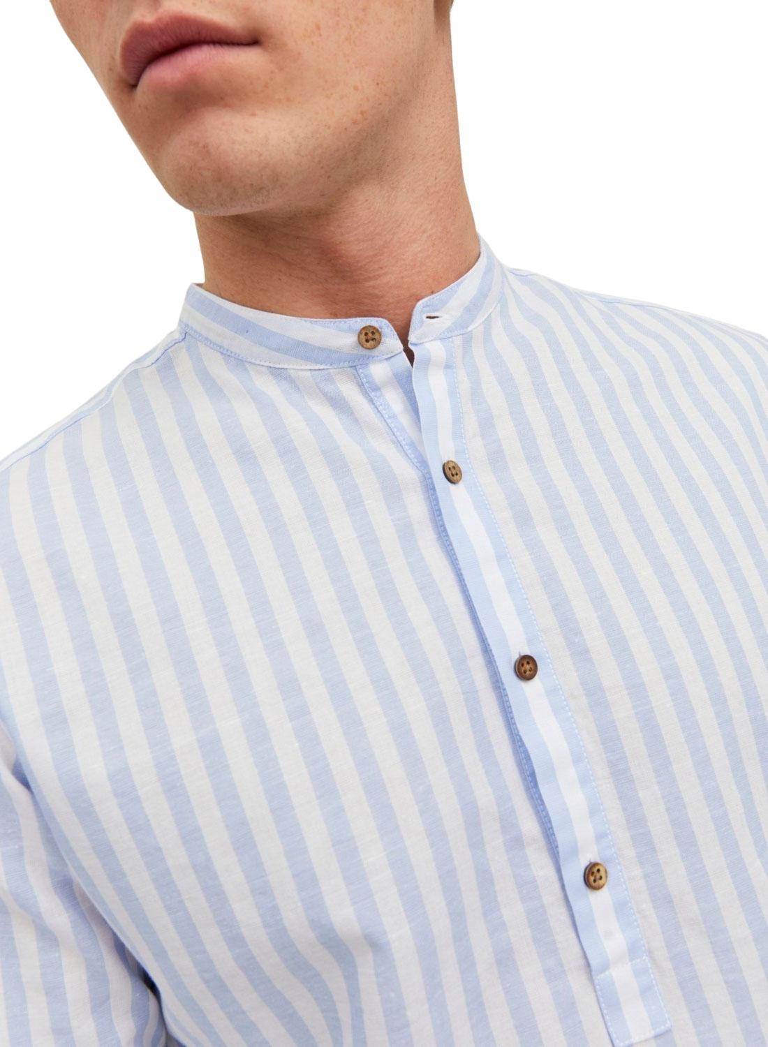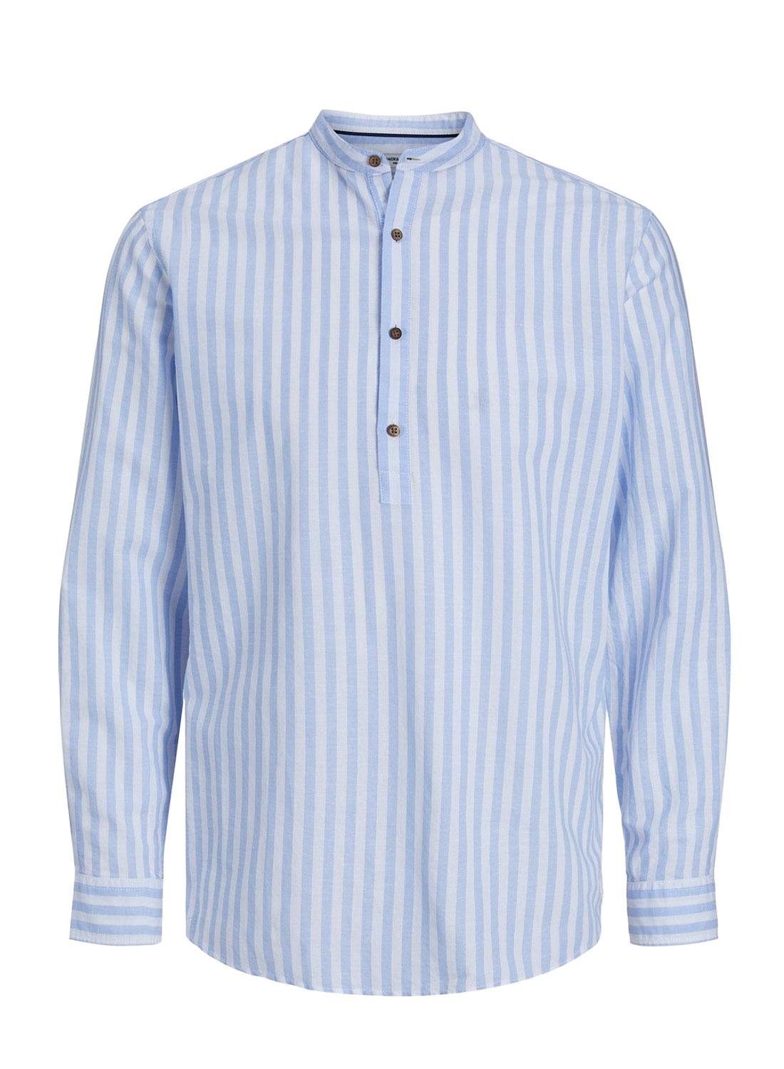 Camisa Jack & Jones. Modelo Blasumme. Cor azul. Manga longo. pescoço Mao. Projeto para Listras. Slim fit.