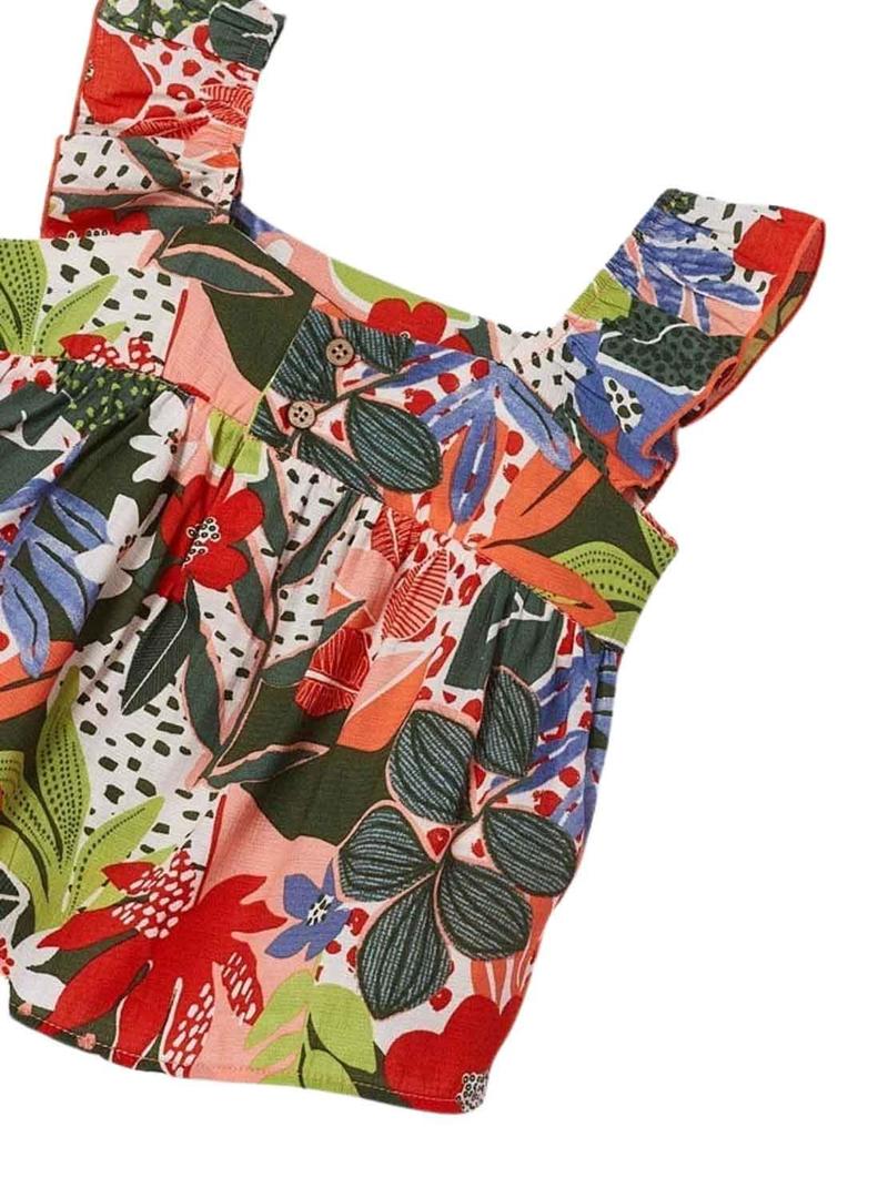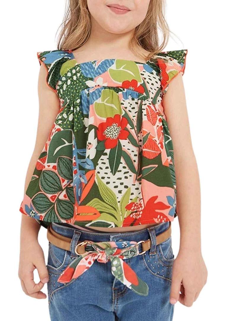 Blusa Mayoral. Com estampa floral em toda a peça. Mangas com babados. mangas elásticas. Decote quadrado. Corte no peito.