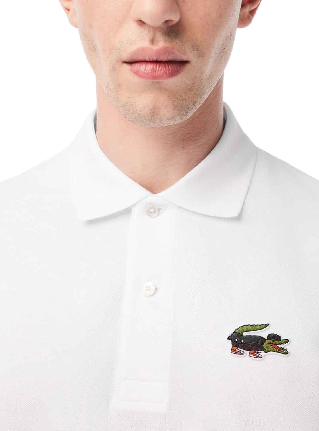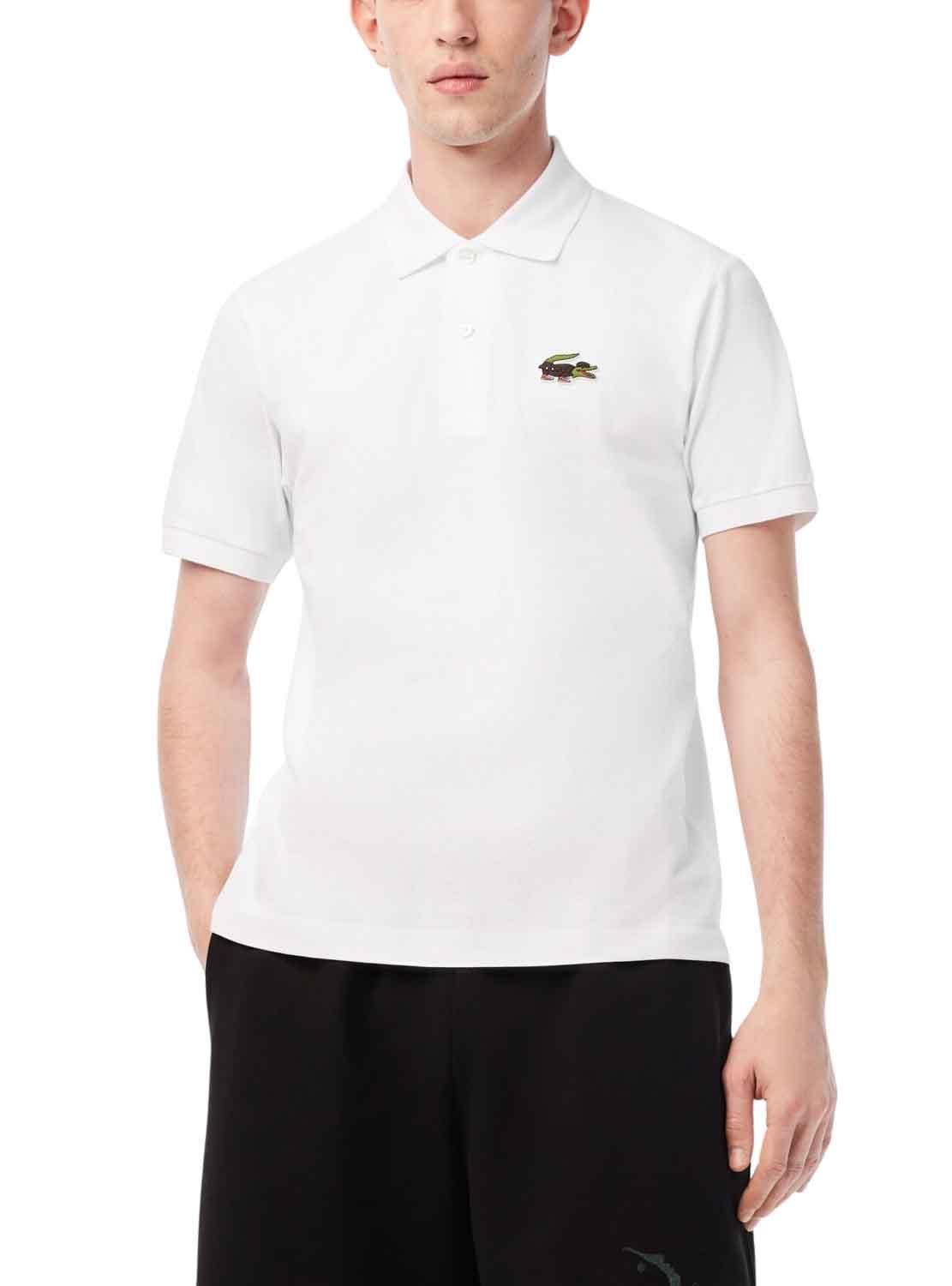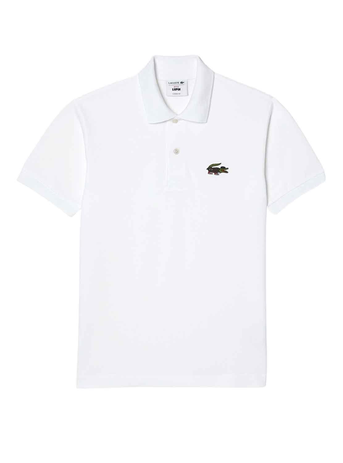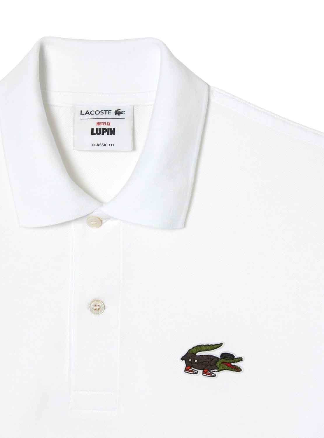 Polo Lacoste. Modelo Netflix Lupin. Cor branco. Manga curto. Gola pólo com dois botões. Crocodile da Lacoste adaptado para a série Lupin da Netflix. Regular fit.