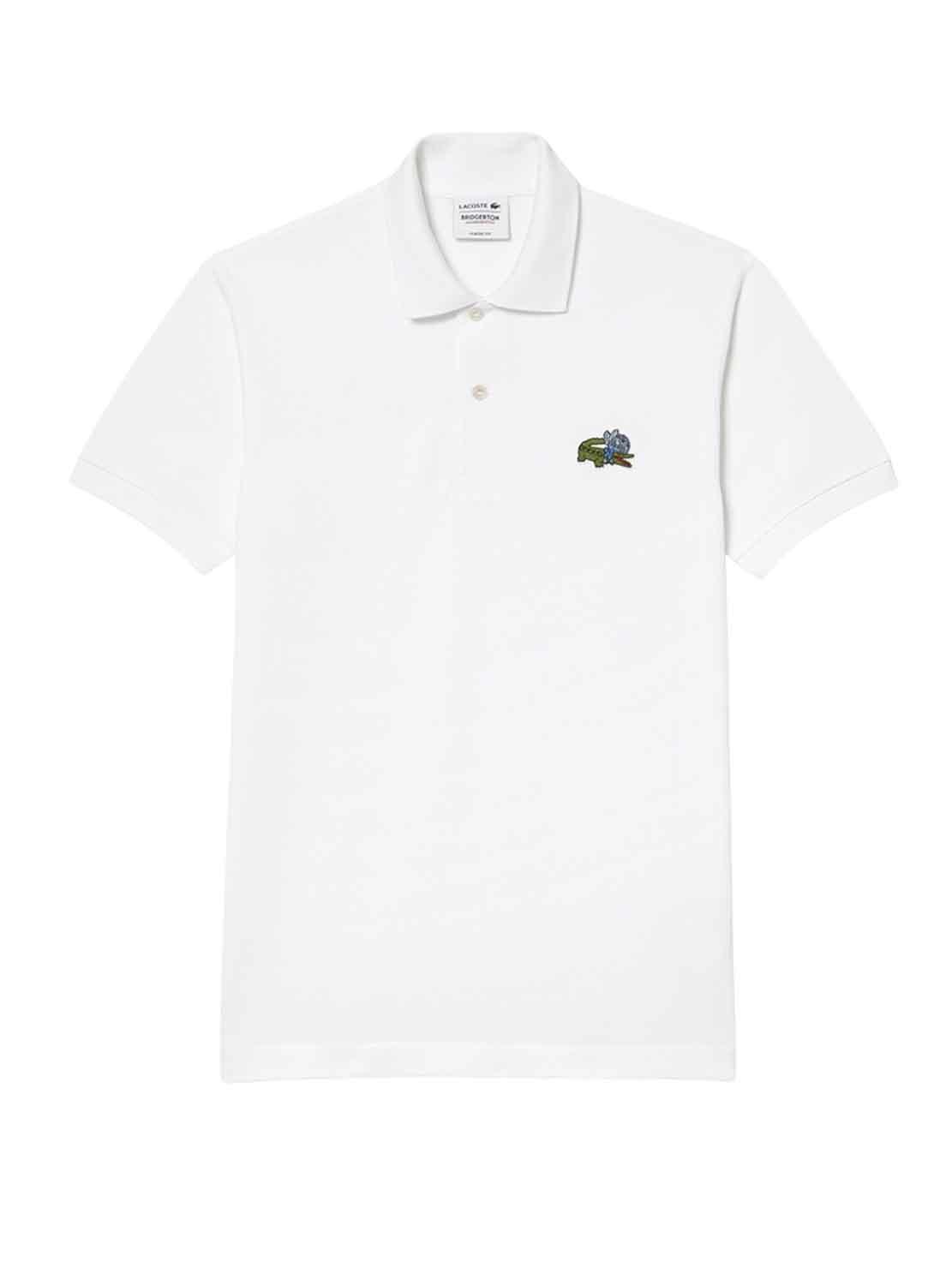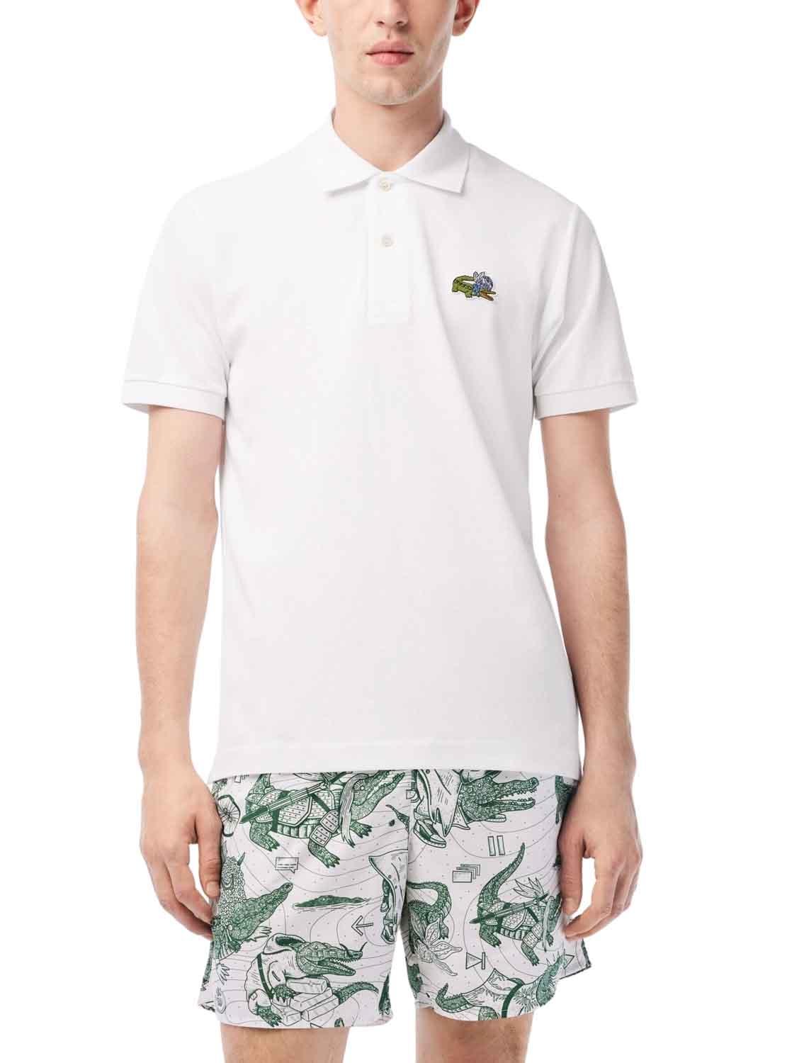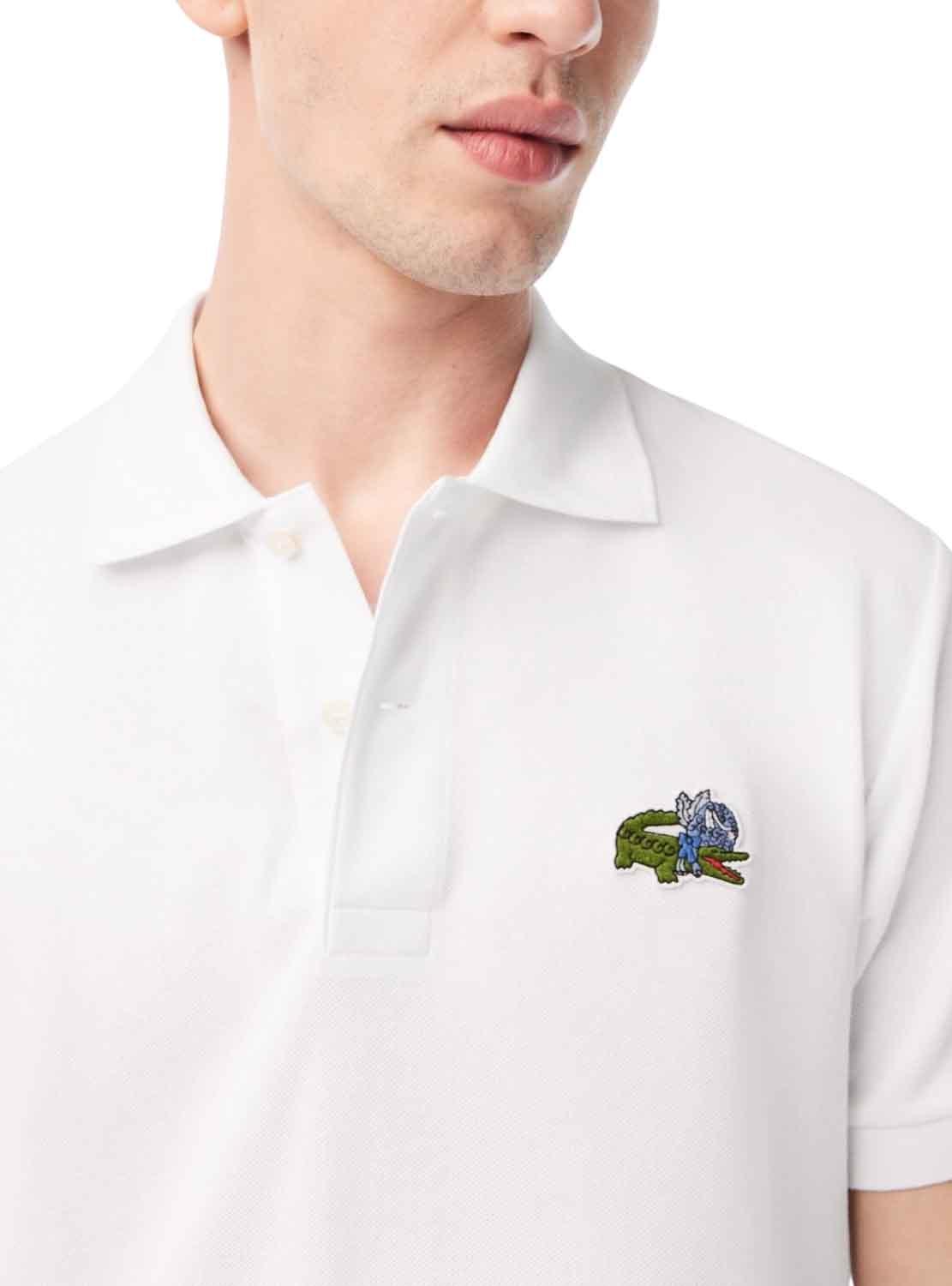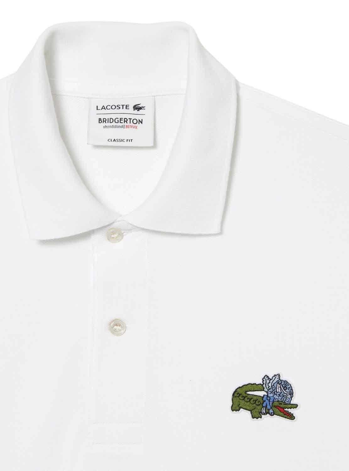 Polo Lacoste. Modelo Netflix Bridgerton. Cor branco. Gola pólo com 2 botões. Manga curto. Crocodile da Lacoste inspirado na série Bridgerton da Netflix. Regular fit.