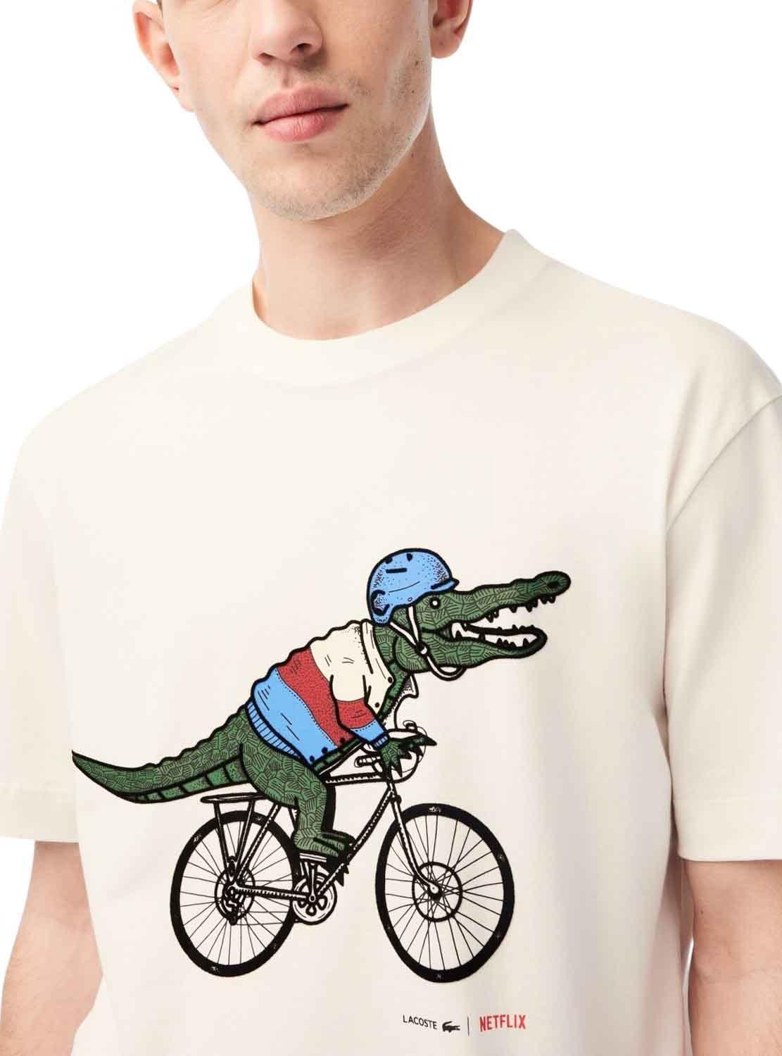 T-Shirt Lacoste. Modelo Netflix Sex Education. Cor bege. Homem para. Manga curto. Pescoço redondo. Logotipo da marca inspirado na série Sex Education da Netflix. Corte clássico.