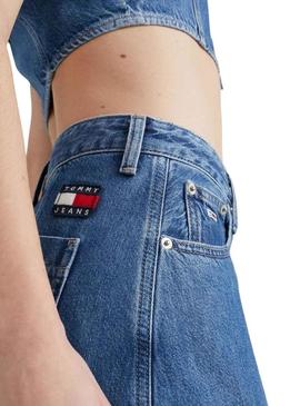 Saia Tommy Jeans. Modelo linha A. Cor azul. 5 bolsos. Fecho de botão. Bandeira da marca nas costas.