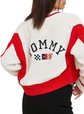Camisola Tommy Jeans listrada em branco e azul Varsity para mulher.