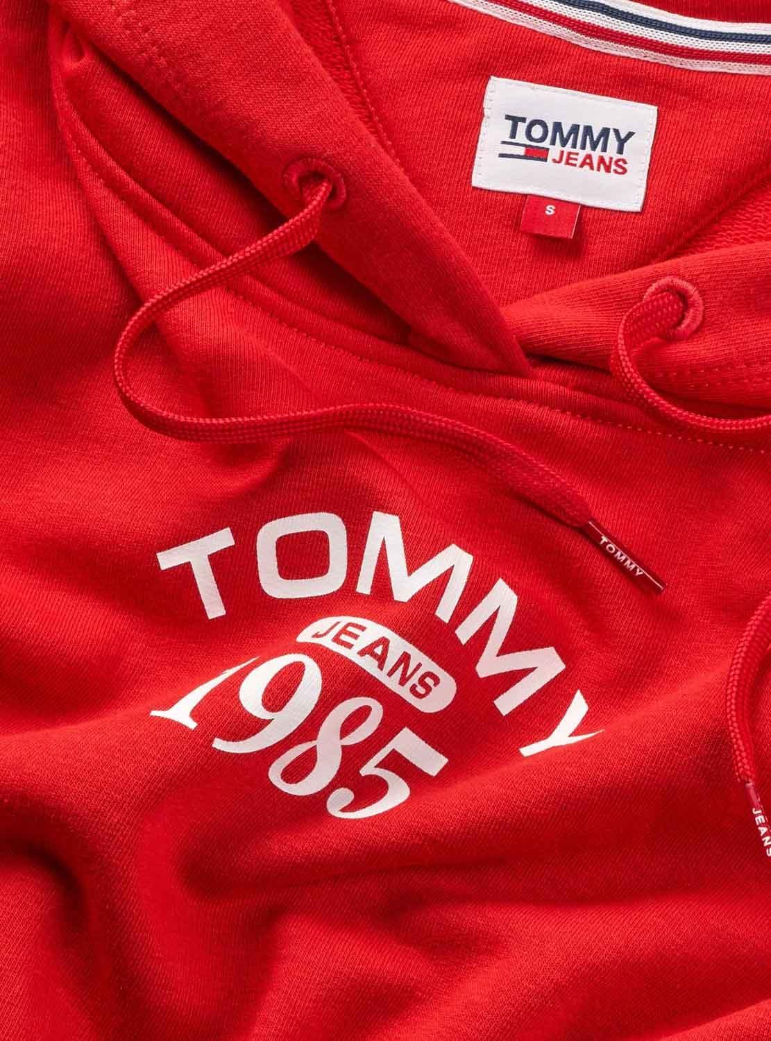 Sweat Tommy Jeans. Modelo Relaxed Essential. Cor vermelho. Com capuz ajustável com cordões. Logo impresso na parte de trás. Punhos em malha elástica. Corte largo. Ombros caídos. Remendo do logotipo. velo de mistura de algodão