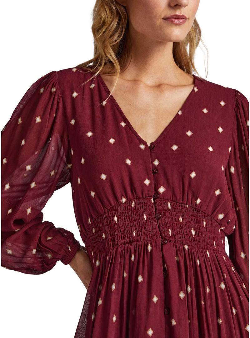 Vestido longo Pepe Jeans. Modelo Gio. Cor granada. Integral Printed. Manga longo. Decote em V. Tecido fluido. Botões decorativos. Feito com materiais sustentáveis.