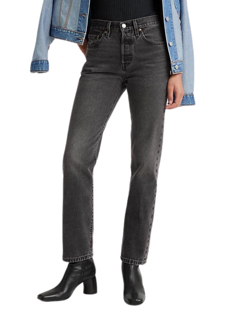 Calças Jeans Levis. Modelo 501. Cor preto. High rise de 28 cm. perna reta Etiqueta do logotipo na cintura. Fábrica de algodão. Detalhes distintivos. Tecido desgastado. Fecho de botão. Lado Bolsos. A modelo está usando o tamanho 2730.