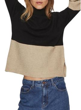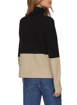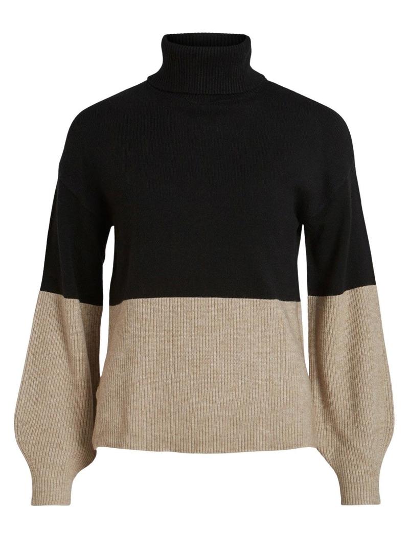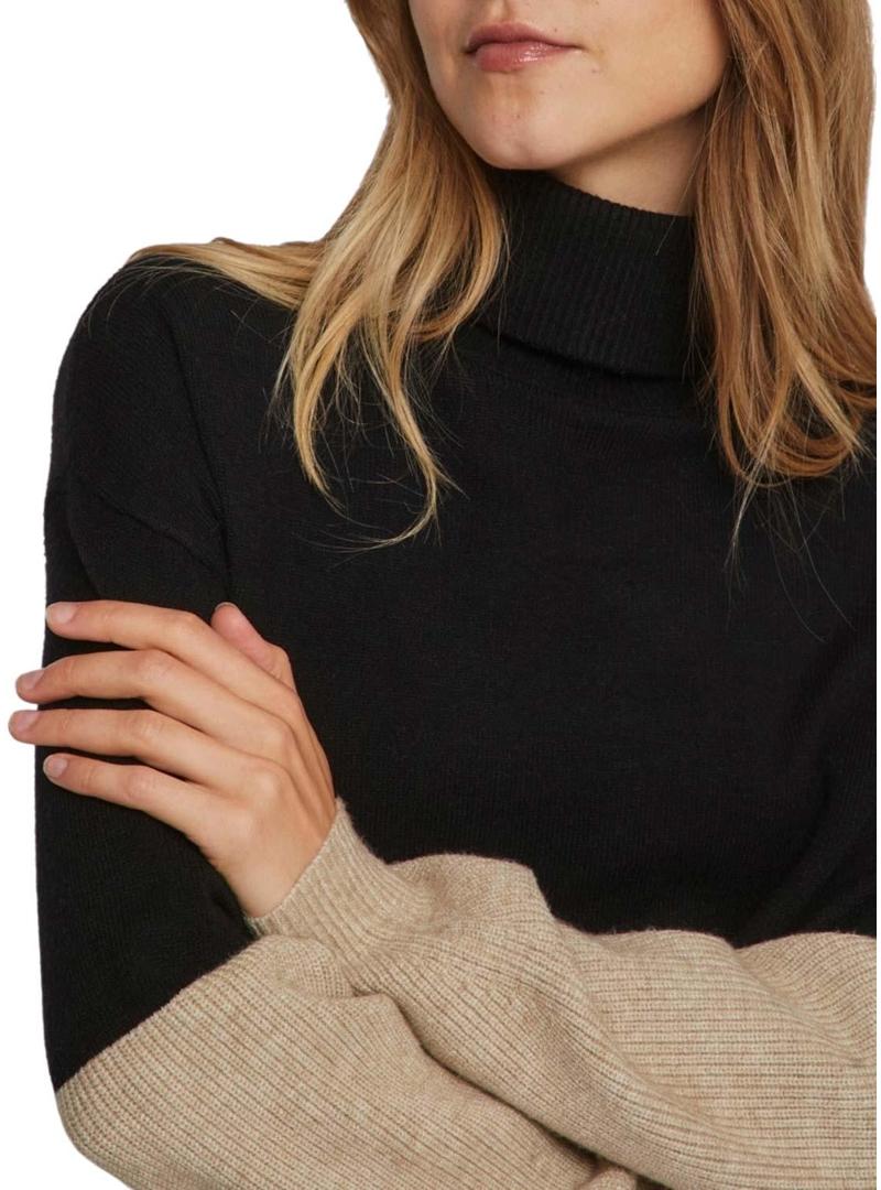 Camisola tricotado Vila. Bloco Cor preto e bege. Mangas inchados. Pescoço longo. Punhos e pescoço elásticos. Knitted macio e elástico. Regular fit Gola alta. A modelo está usando tamanho M.