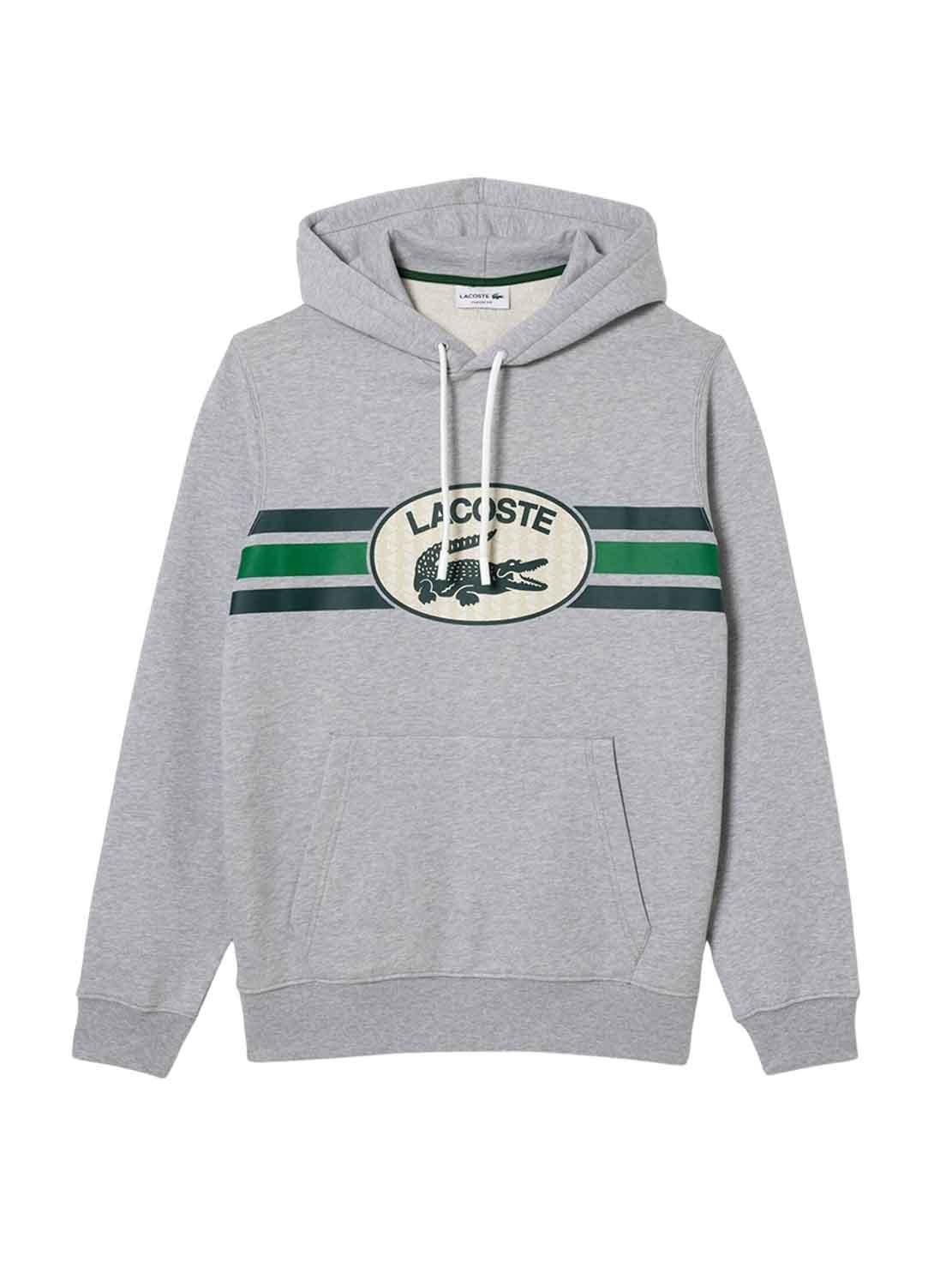 SweatLacoste. Modelo Loose Fit. Cor cinza. Com capuz ajustável. Logo impresso no peito. Estilo canguru Bolso. Punhos e bainha elásticos. Loose Fit. Capuz com atacadores ajustáveis. Crocodile bordado no peito.