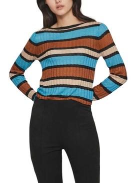 Camisola Vila. Modelo Viember. Printed de Listras. Pescoço redondo. Manga longo. Tecido semitransparente. Regular fit. A modelo está usando tamanho M.