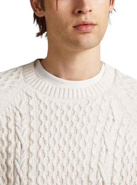 Camisola Pepe Jeans. Modelo manhoso. Cor branco. Gola redonda elástica. Tecido tricotado. Extremidades elásticas. Manga longo. Etiqueta do logotipo. Feito com algodão sustentável. A modelo está usando tamanho M.