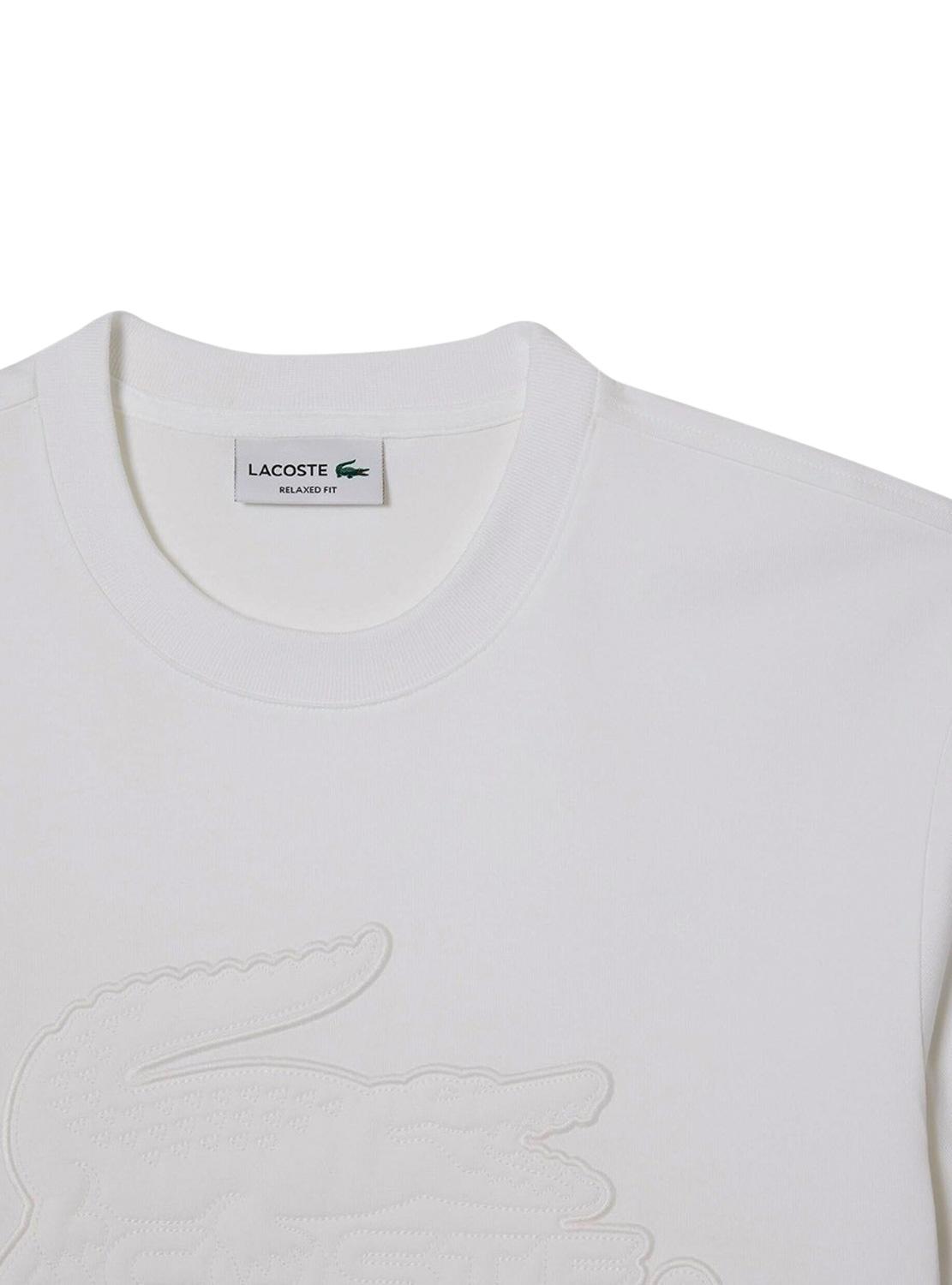 T-ShirtLacoste. Modelo básico TH2104. Cor branco. Manga curto. Gola redonda elástica. Ombros caídos. Logo no peito. Crocodile nas costas. A modelo está usando tamanho M.