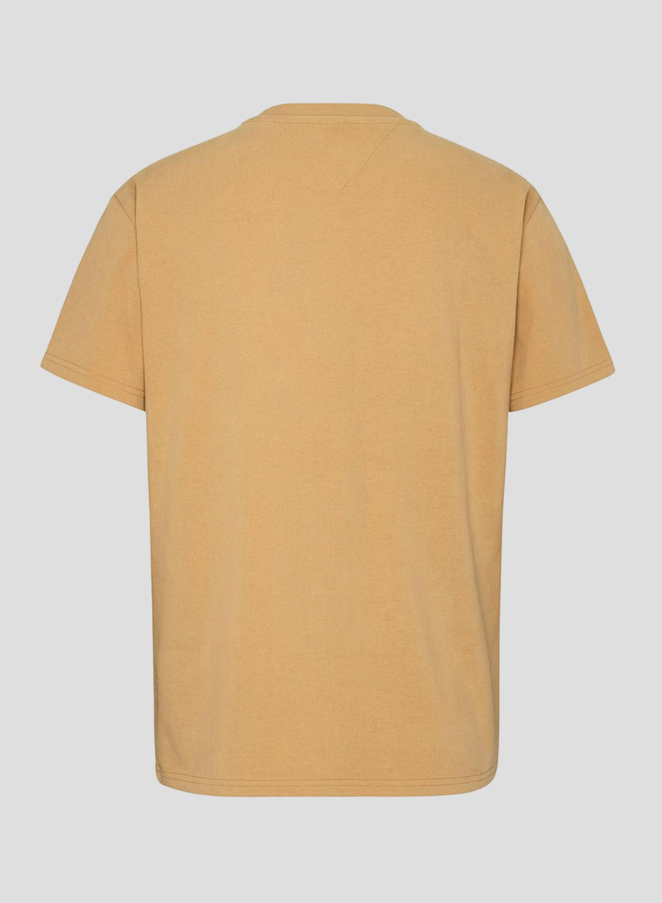T-Shirt Tommy Jeans. Cor camel. Gola redonda canelada. Manga curto. Formato clássico. Patch do logotipo Tommy Jeans na manga. Logo impresso no peito.