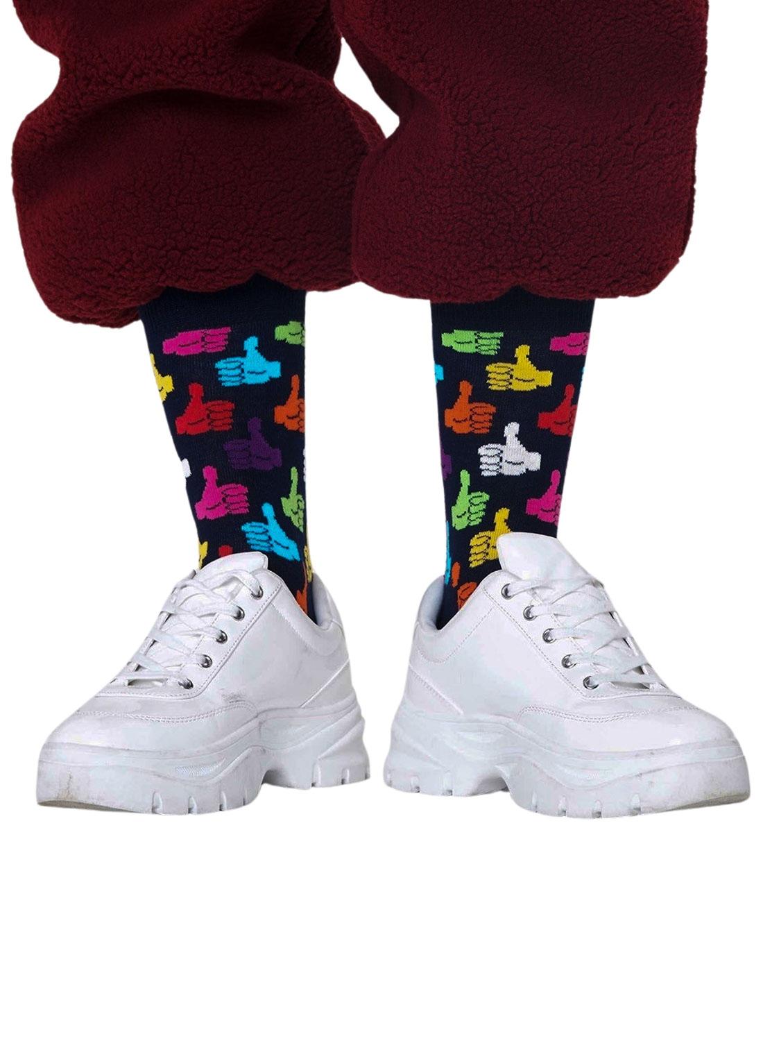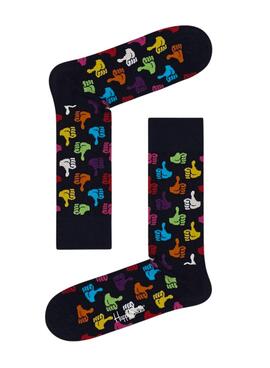 Maias Happy Socks. Modo polegares. Eixo alto. Fundo preto com desenhos multicoloridos. Algodão penteado. Calcanhar e biqueira reforçados.