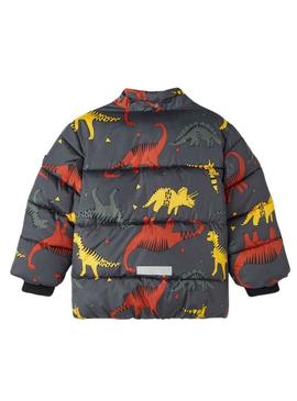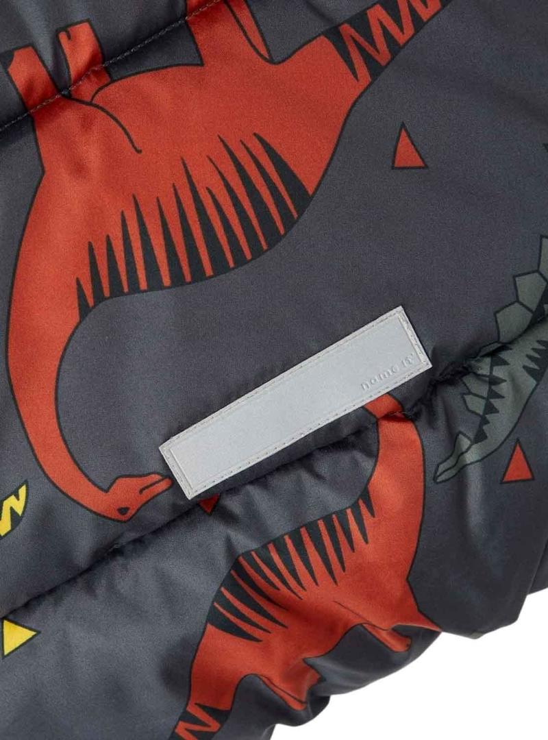 Casaco Name It. Modelo May Puffer. Cor cinza. Estampado de crocodilos. Gola alta. Com capuz removível. Bolsos laterais. Tecido acolchoado.